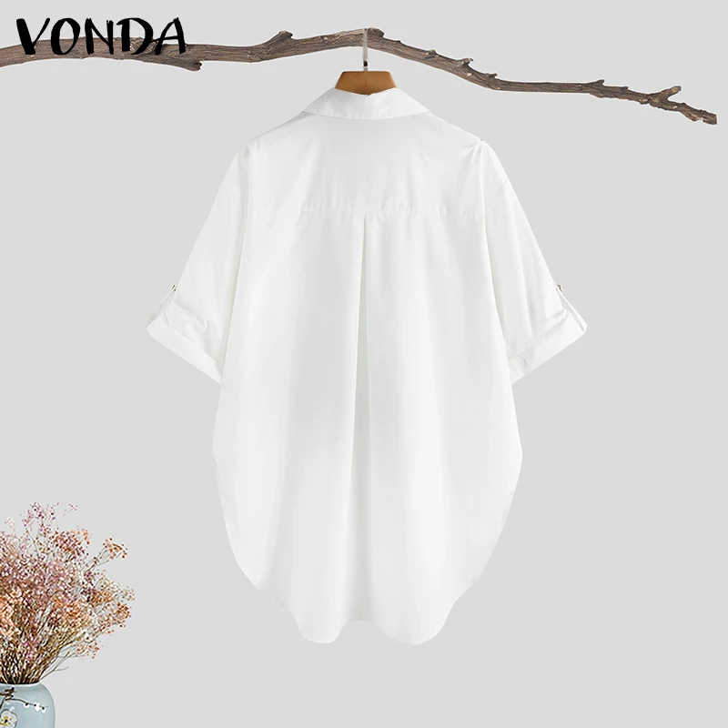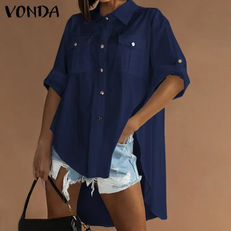 Повседневные Асимметричные рубашки с длинным рукавом 2021 VONDA, Женские однотонные топы, женские офисные рубашки с отложным воротником, блузки, женские блузы