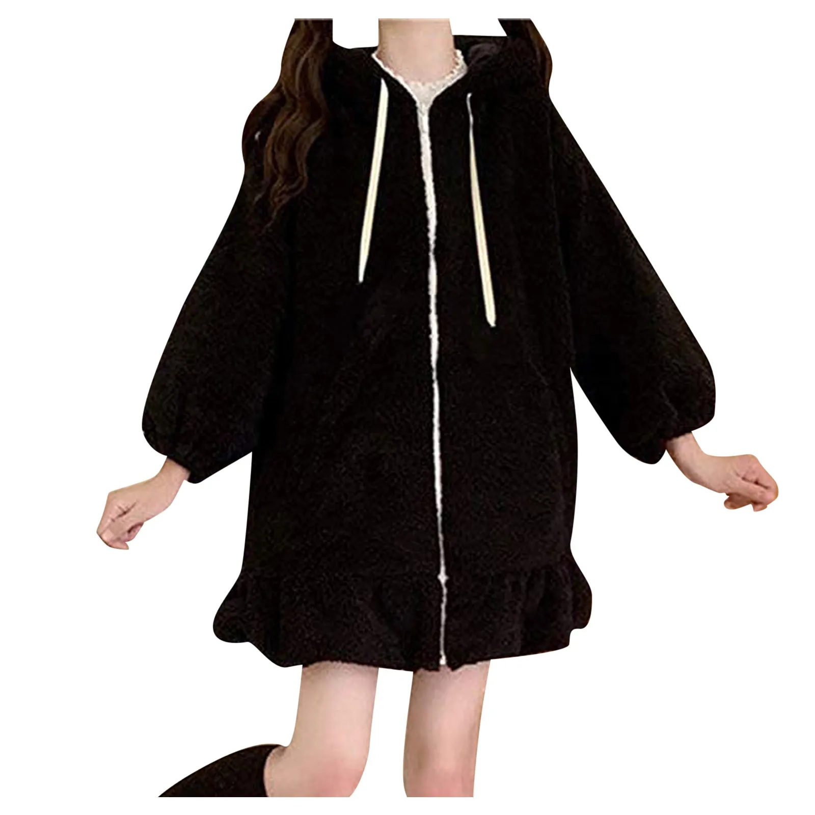 Милое плюшевое пальто из искусственного меха с заячьими ушками для женщин, зимняя плюшевая куртка с капюшоном Lolita Kawaii, женское теплое черное пушистое пальто, верхняя одежда