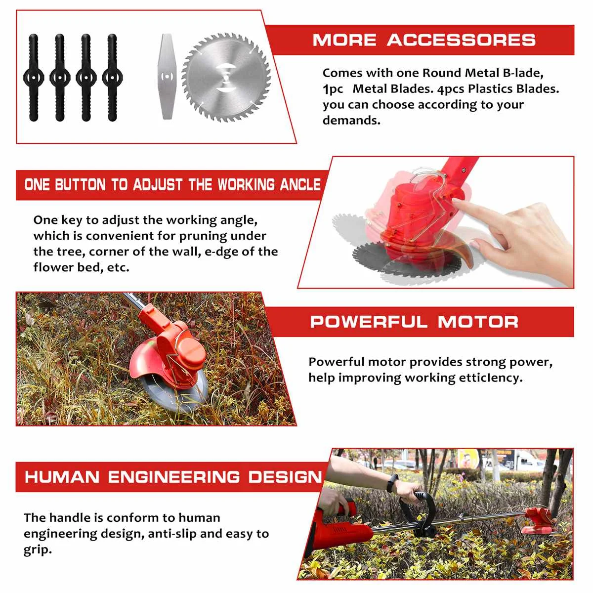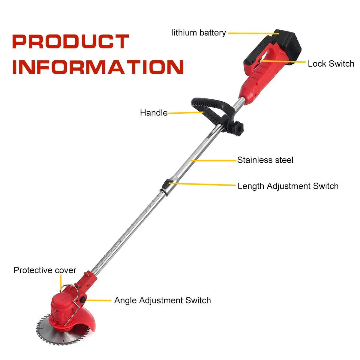 Спецификация:Цвет: красныйМощность: 1580 ВтЕмкость аккумулятора: 4000/7000/13000/20000 мАчСкорость: 6000 об/минРегулируемая длина: 93 ~ 128 смОсобенности:-Водонепроницаемая головка машины удобна для чистки.-Мощный двигатель из чистой меди.-Беспроводная Конструкция литиевой батареи, низкое энергопотребление и низкий уровень шума.-С защитным краем травы, он может предотвратить брызги травы во время обработки.-Стальная рама с защитой от столкновений может избежать случайной потери ударов и одновременно уменьшить лезвие.-Легко справиться с ямами, волнистыми, землей, лужайкой, цветочной кроватью, под шпалерным цветком и другими зонами.-Косите траву на плоской поверхности, быстро обрежьте траву на лужайке, с гибким углом и быстро Срежьте уклон сена.-Двойной переключатель управления, два переключателя должны быть запущены нажатием нижней части в то же время, что безопаснее, чтобы избежать случайного касания.-Эргономичный дизайн ручки, ручка может регулировать направление по желанию, удобно держать, и она не устает от работы в течение длительного времени.Примечание:1. При ручном измерении допускается погрешность в 1-3 см, спасибо.2. Из-за разницы между различными мониторами изображение может не отражать фактический цвет изделия. Мы гарантируем, что модель реального изделия не отличается от представленной на фото. Пожалуйста, поймите, спасибо!