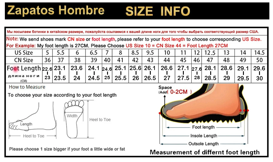 Важное примечание: Длина стопы не соответствует длине стельки. Длина стопы не соответствует длине подошвы. Длина стопы <длина стельки <длина подошвы 1. Пожалуйста, выберите размер в соответствии с длиной стопы (Не выбирайте размер в соответствии с обычным размером вашей страны!) Например: если вы измеряете каблук до носка 27 см, пожалуйста, выберите размер 44 = американский размер 10 2. Наша обувь отмечена китайским размером обуви или соответствующей длине стопы. 3. Размер CN 44(27 см). Эта длина стельки 27 см не соответствует длине подошвы, это означает только длину стопы. 4. Из-за различных настроек дисплея и угла съемки цвет может немного отличаться от реального. *** Если у вас есть какие-либо вопросы, пожалуйста, свяжитесь со мной. *** *** Таблица размеров ***