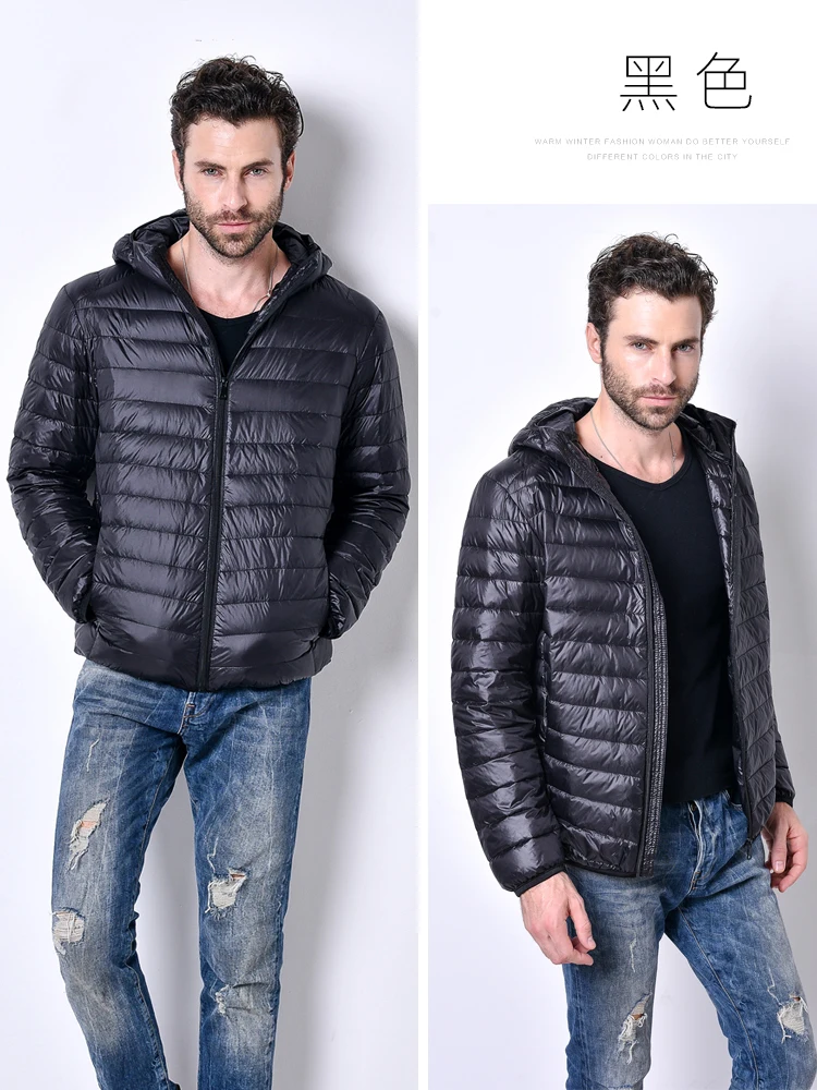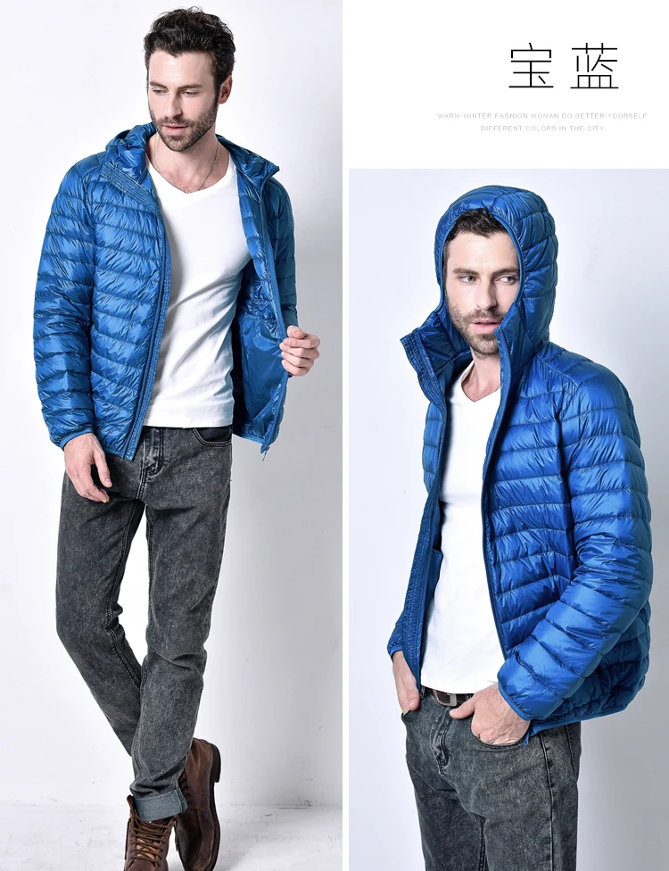 Зимний мужской пуховик, Сверхлегкий, тонкий, на белом утином пуху, с капюшоном, с длинным рукавом, теплая парка, однотонная, портативная верхняя одежда