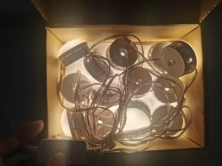 Прибыли на почту недели через 2 после заказа.С продавцом общаться не пришлось. Маленькие акккуратные фонарики, крепятся на двусторонний скотч или присоски (и тем те в комплекте).Фонарики крутятся вокруг оси ,наматывая шнур, регулируется длина провода. Три вида освещения: холодный,теплый,смешанный. И регулирует мощность. Взяла комплект из 14, они не очень мощные, светят мягко. Нужно основное ещё освещение.