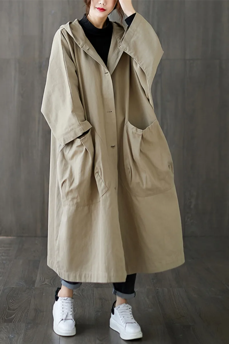 Женское длинное пальто, модная Корейская ветровка, большой размер, Женский Тренч, осень 2021, с капюшоном, свободные карманы, кардиган, женское длинное пальто