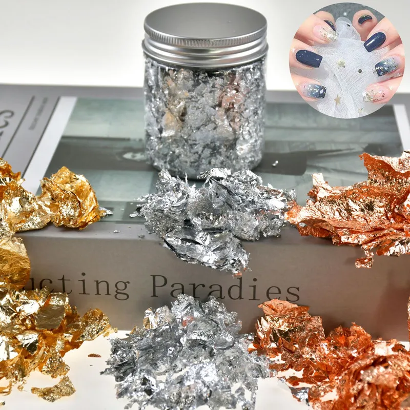С золотыми, серебряными и медными цветами, хлопья из золотой фольги не легко выцветают и окисляются, они могут создать потрясающий Блестящий текстурированный эффект, чтобы ваши поделки выглядели особенными.
