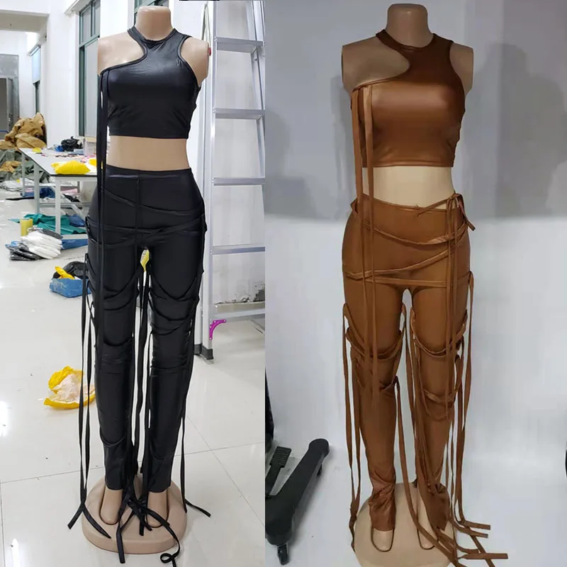 Женский комплект из топа и брюк, комплект из двух предметов из искусственной кожи на одно плечо, облегающая пикантная одежда для клувечерние, праздничная одежда