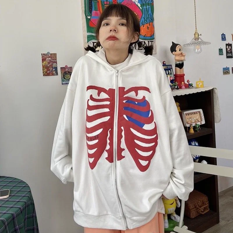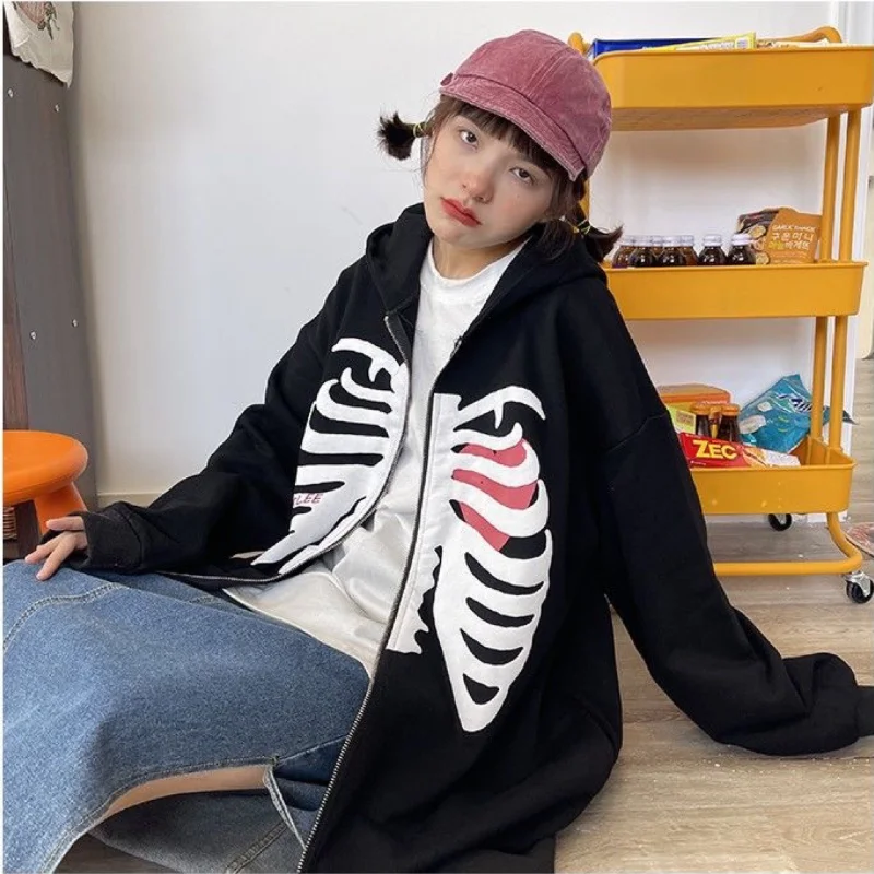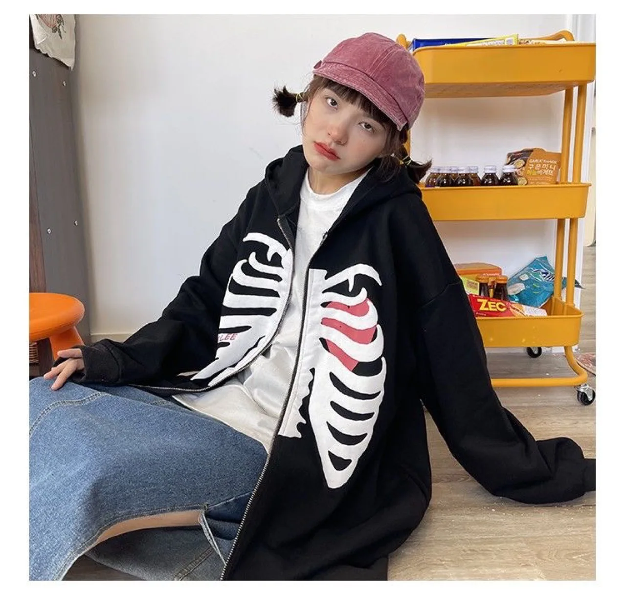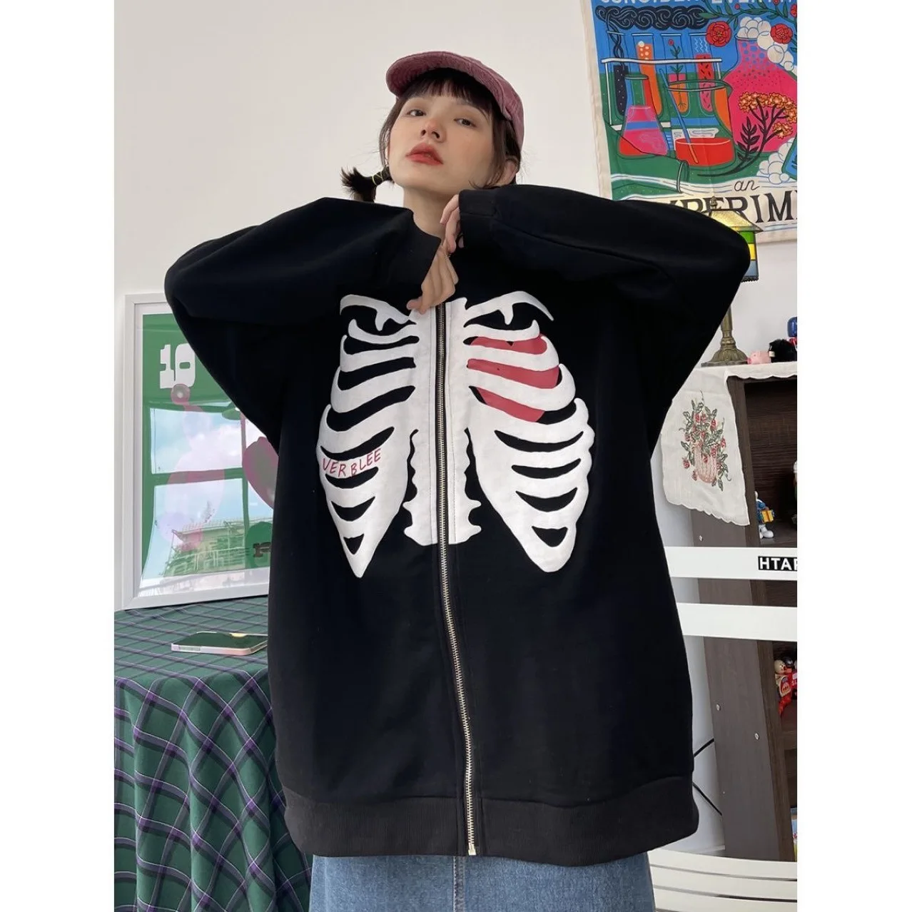 Толстовка Y2K в стиле Харадзюку со скелетом на молнии, Мужская толс...