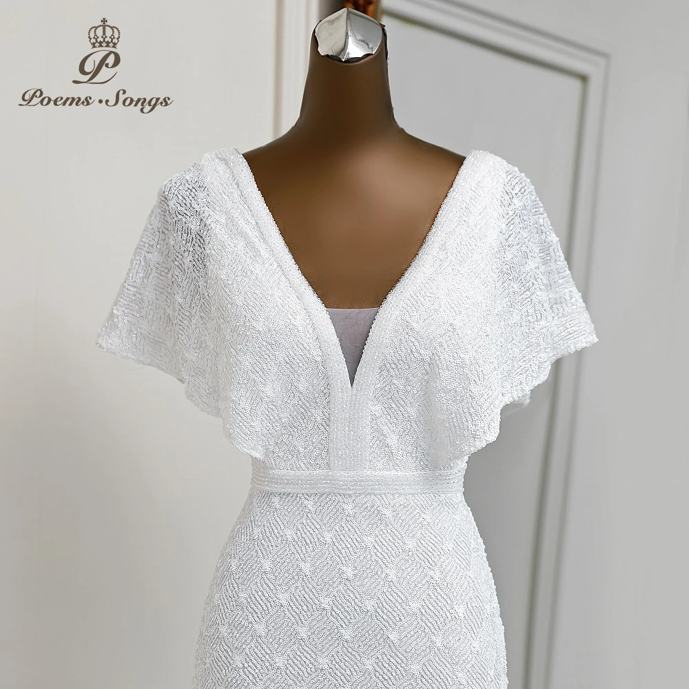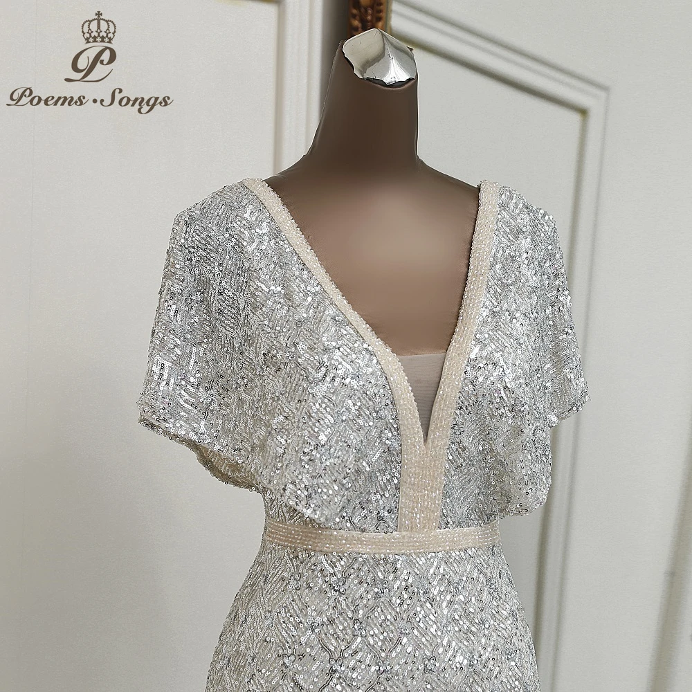 Женское вечернее платье серебристого цвета с глубоким V-образным вырезом