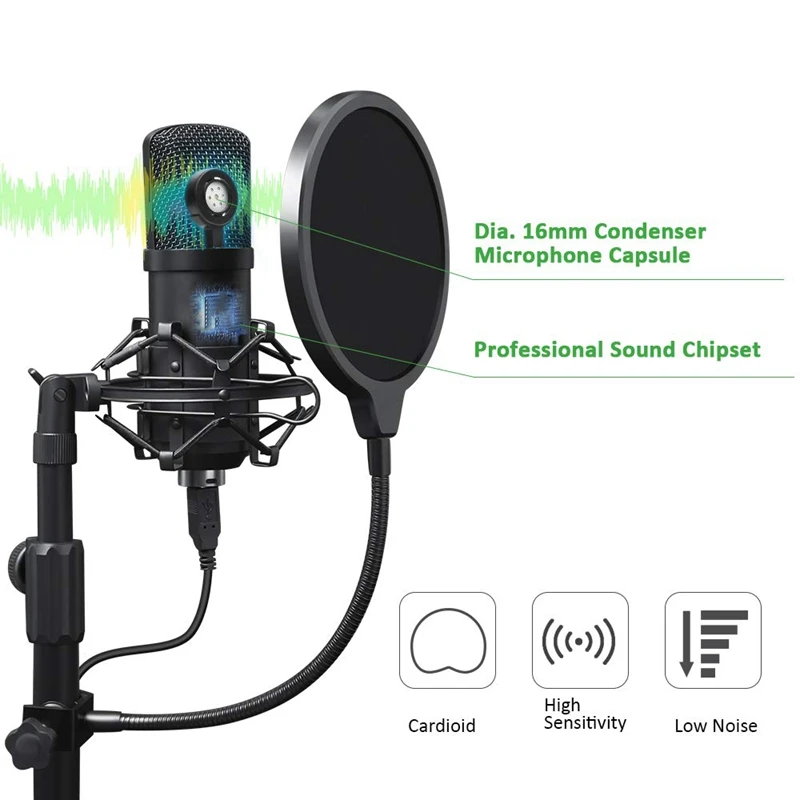Профессиональный звуковой чипсет 192 кГц/24 бит: Этот конденсаторный микрофон был разработан с профессиональным звуковым чипсетом, который позволяет микрофону USB держать высокую скорость дискретизации. Частота дискретизации: 192 кГц/24 бит! Плавная, плоская частотная характеристика 30 Гц-16 кГц-Расширенная частотная характеристика отлично подходит для пения, речи и голоса, отлично воспроизводит звук, высококачественный микрофон гарантирует, что Ваш изысканный звук воспроизводит в ИнтернетеPLUG and PLAY: Микрофон имеет порт данных USB 2,0, который легко подключается к компьютеру и операционной системе Linux, и не требует дополнительного программного обеспечения драйвера, и нет необходимости в внешней звуковой карте. Двойное экранирование usb-кабеля уменьшает помехи. Это позволяет легко звучать на подкасте, livestream, видеозвонке или в большинстве других видов записи16 мм электретный конденсаторный преобразователь и магнитное кольцо: с 16 мм электретным конденсаторным преобразователем usb-микрофон может дать вам сильную реакцию басов. Этот профессиональный конденсаторный микрофон поднимает кристально чистое аудио. Магнитное кольцо, на usb-микрофонном кабеле, имеет сильную функцию защиты от помех, что позволяет вам чувствовать себя лучшеСтабильная и портативная конструкция: прочная и стабильная на подставке, которая является металлическим корпусом, очень прочной. Недавно разработанный стенд позволяет микрофону более стабильно и легко регулировать, что даст вам лучший опытСовместимость со всеми ОС: для всех ноутбуков, ПК и мобильных телефонов. Но если вы хотите подключиться к телефону, вам нужен адаптер OTG (не входит в комплект). Сильный выход, отсутствие искажений, низкое энергопотребление.Микрофон: конденсаторный микрофонНаправленность: кардиоидЧувствительность: -45bd ± 3bdОтношение сигнал-шум: больше 58bdВходное напряжение: DC5VВыходной интерфейс: интерфейс USBЦвет: черныйМатериал: металл + пластикРазмер: Размеры: 155x45ммУпаковочные палатки:1 * микрофон1 * BOP фильтр1 * телескопический стержень1 * Металлическое основание1 * зажим для микрофона1 * чехол для микрофона1 * USB кабельТолько вышеуказанная посылка, другие товары не включены.Примечание: светильник и различные дисплеи могут привести к тому, что цвет товара на картинке немного отличается от реального. Допускается погрешность в измерениях +/- 1-3 см.