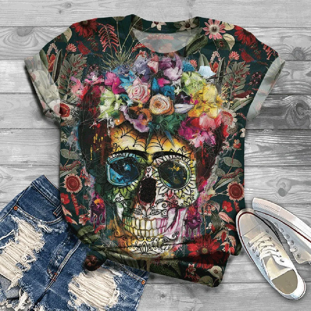 Женская футболка с коротким рукавом, круглым вырезом и 3D-принтом черепа