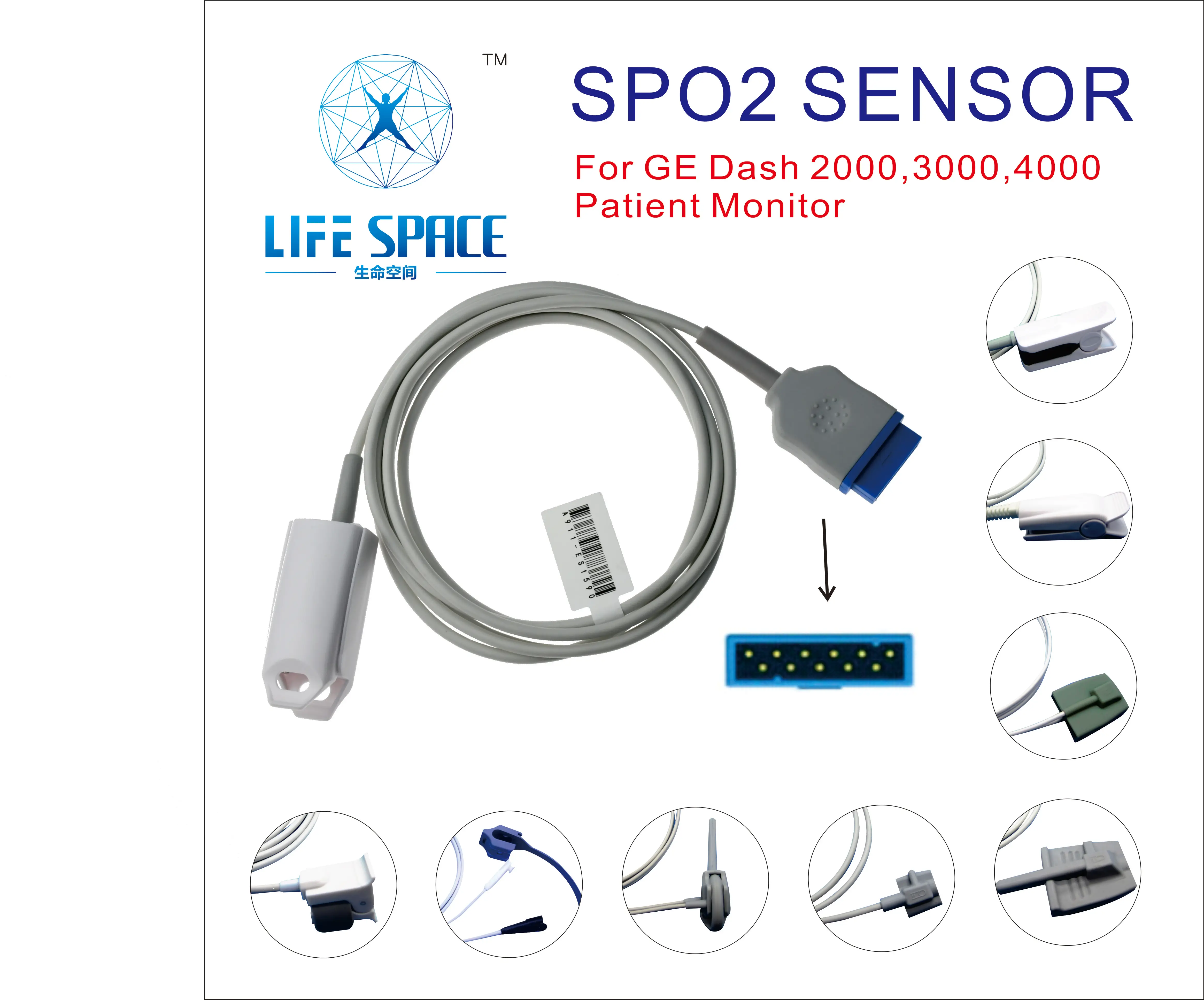 ES-LA-07 длинный кабель 2,5 м, датчик насыщения кислородом для взрослых и детей, многоразовый датчик насыщения кислородом для монитора пациента GE dash2000,3000,4000, массивный модуль