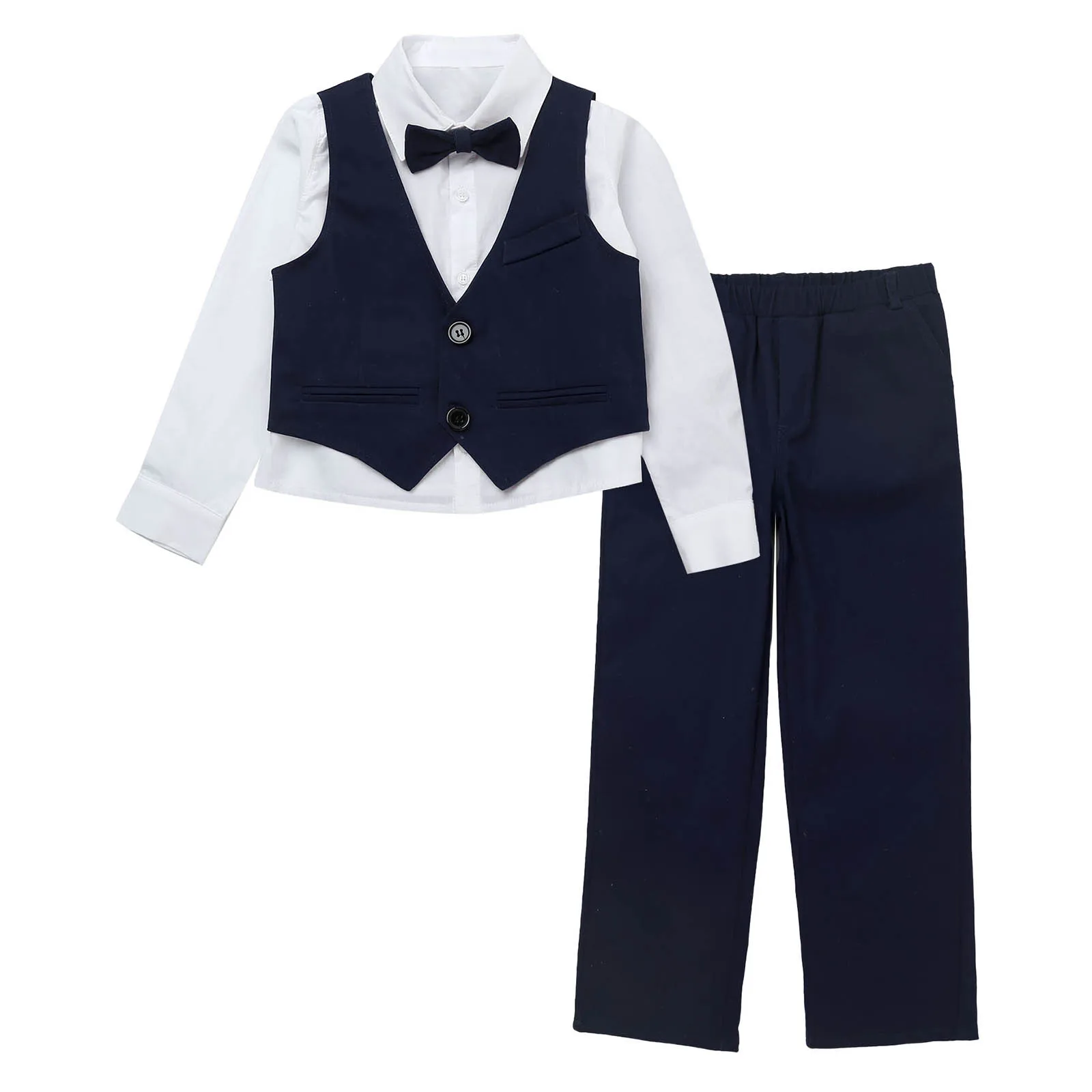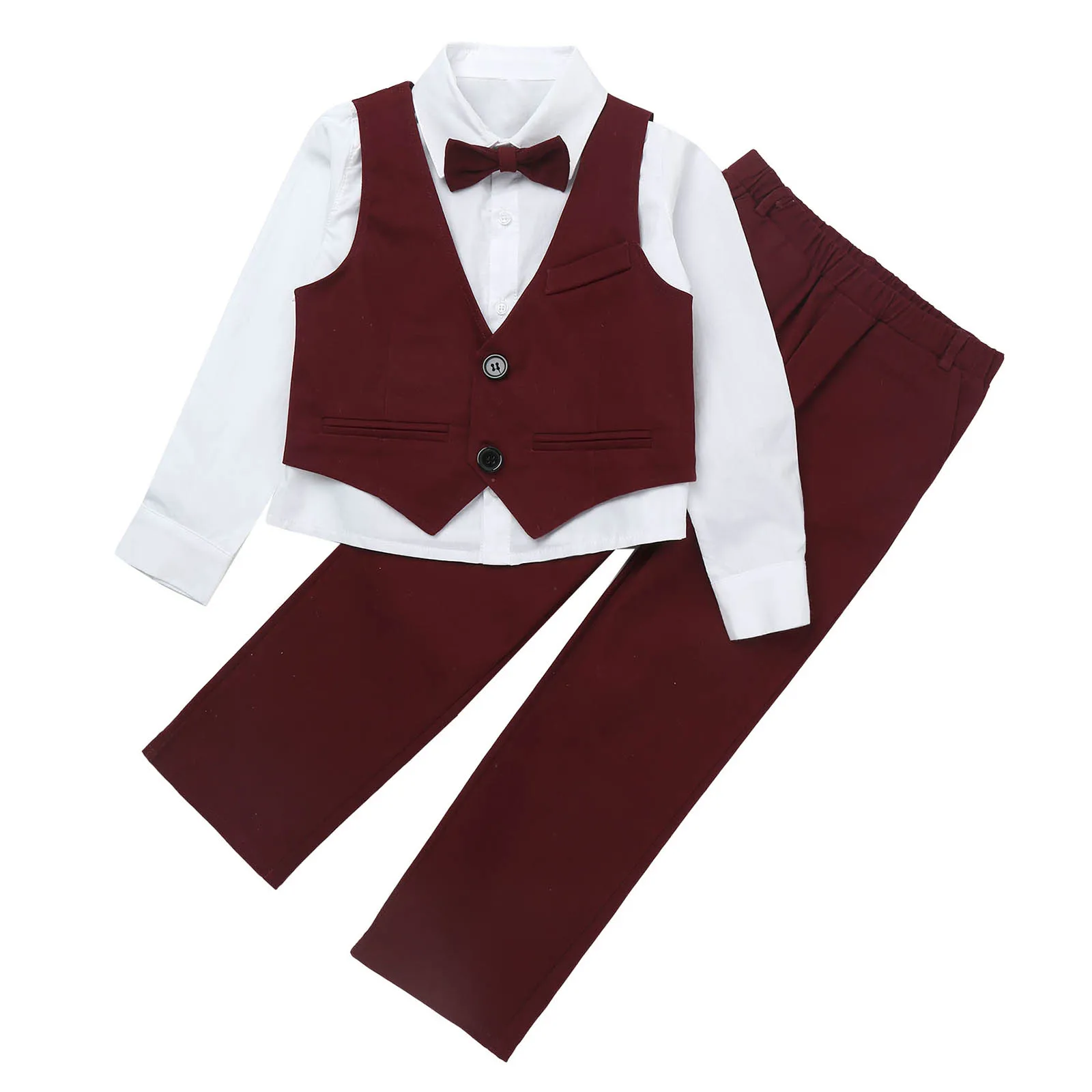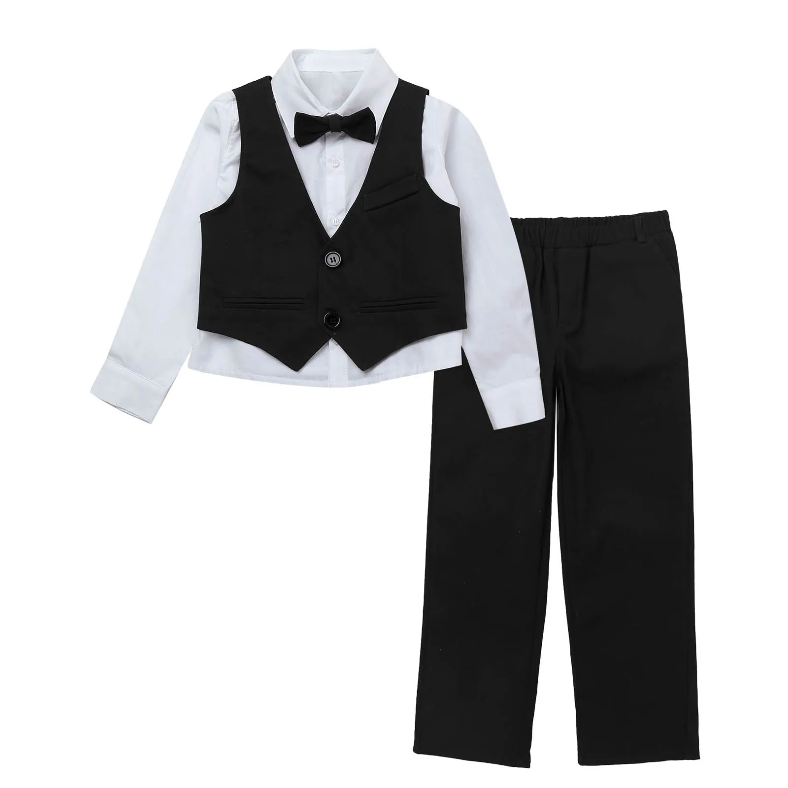 Детские праздничные костюмы для мальчиков, 4 предмета рубашка с длинными рукавами и ОТВОРОТОМ однобортный жилет без рукавов с v-образным вырезом комплект с эластичным поясом и бантом для свадьбы, дня рождения, #2T-10