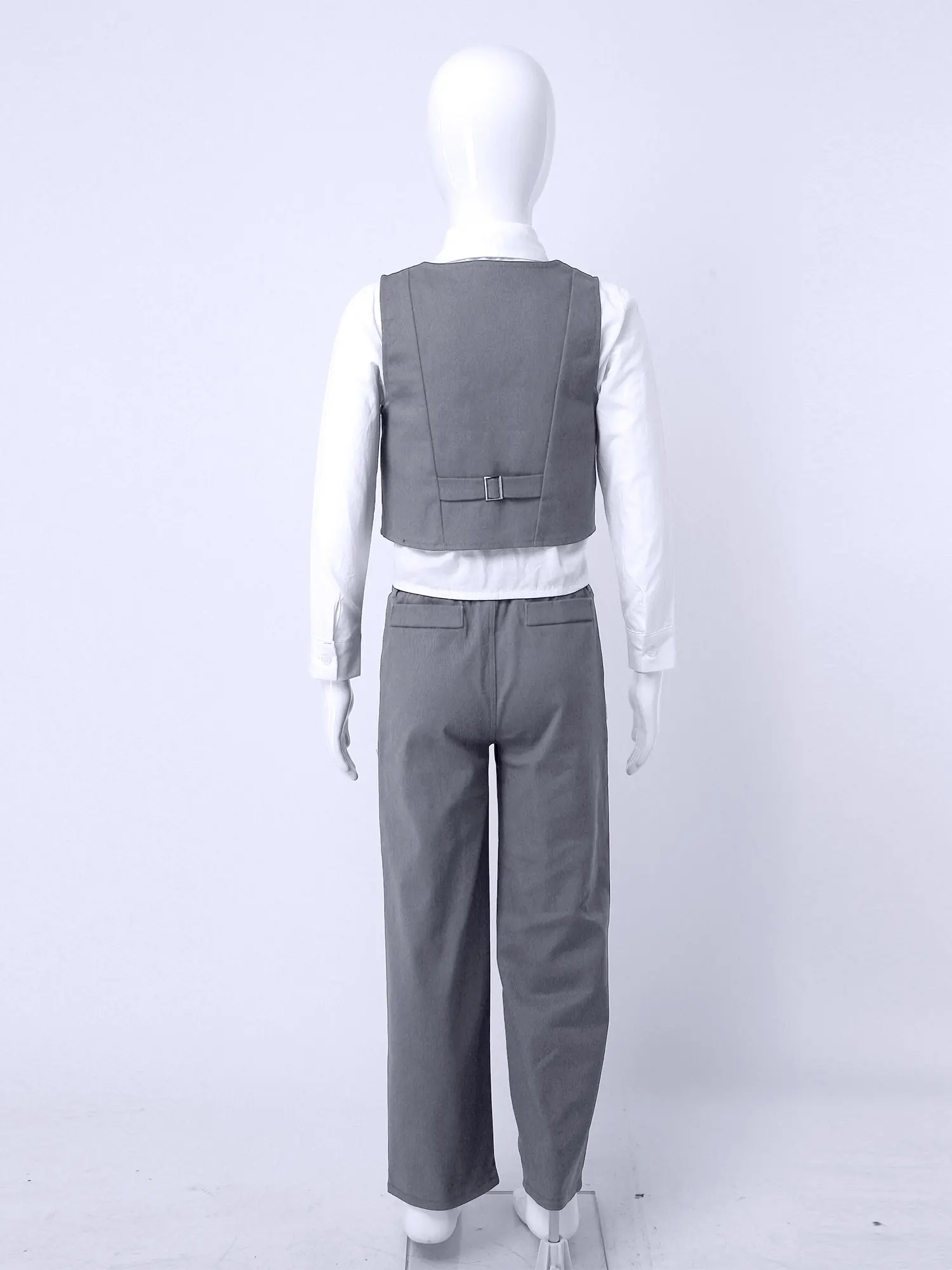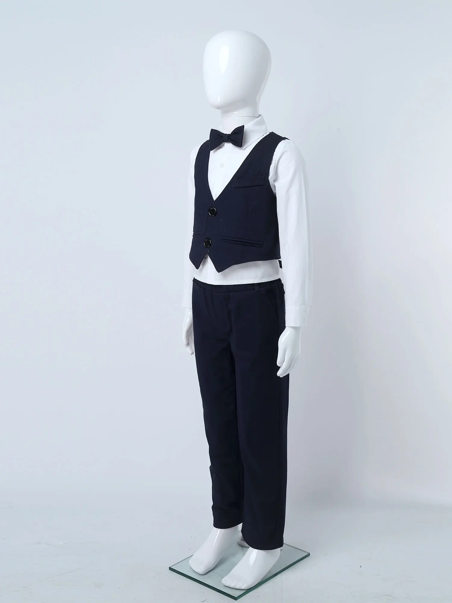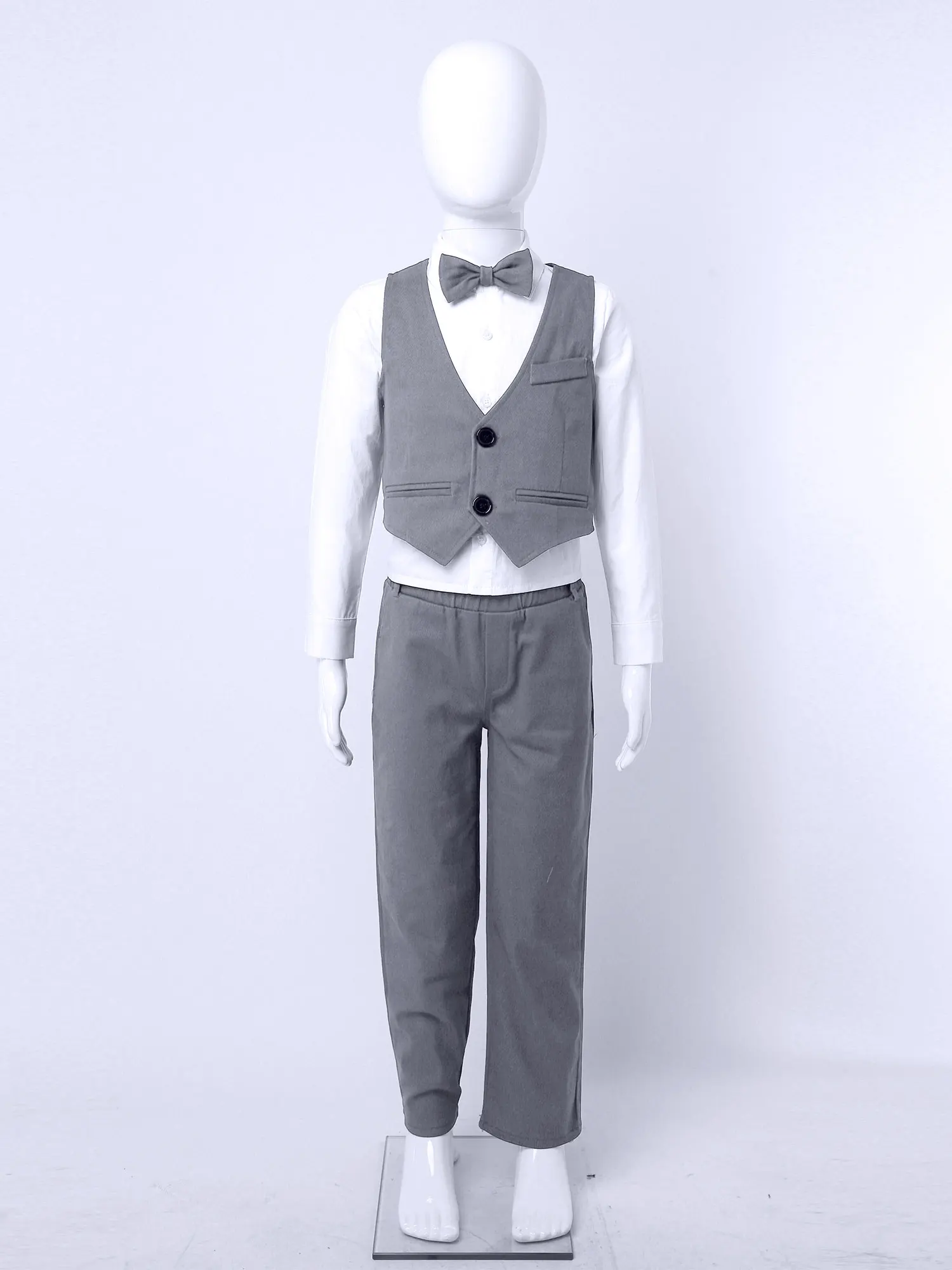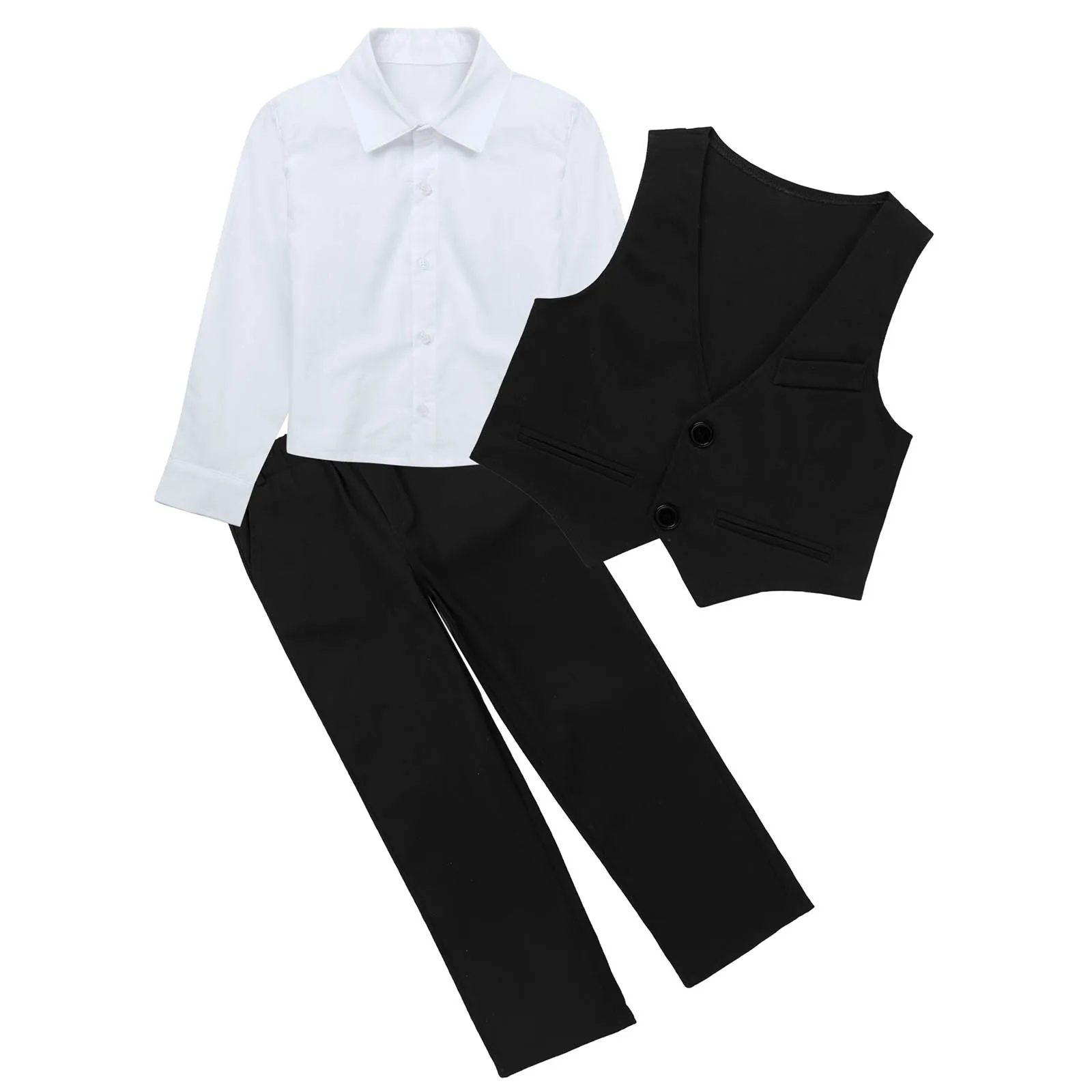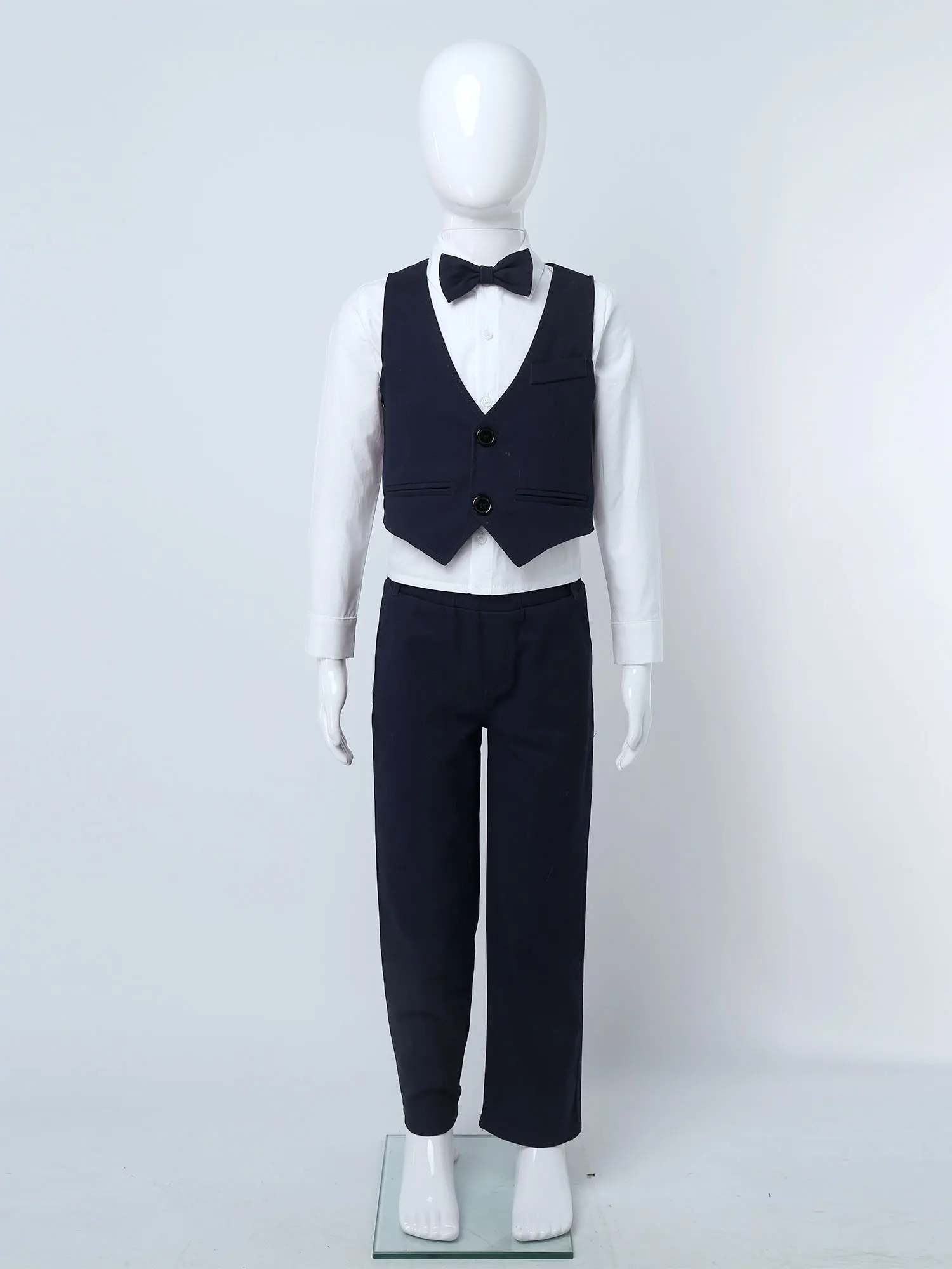 4 шт., детский праздничный костюм для мальчиков из хлопка, удобный и дышащий в носке.Таблица размеров означает возрастные диапазоны для мальчиков, но они предназначены только для общего ознакомления.Однотонная рубашка с отложным воротником и длинными рукавами. V-образный вырез, без рукавов, однобортный жилет.Брюки с эластичным поясом, карманами по бокам, с бантом на завязке.Подходит для дня рождения, вечерние, фотографии, конкурса, свадьбы, выпускного, повседневной носки и т. д.