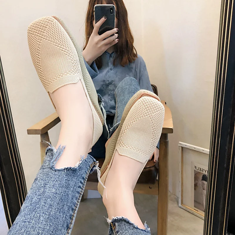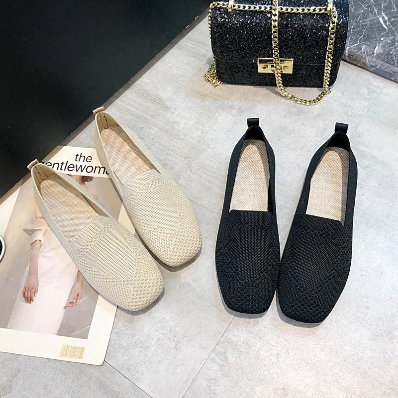 Новинка весны 2021, женские балетки размера плюс, трикотажные дышащие туфли на плоской подошве с квадратным носком, обувь для вождения