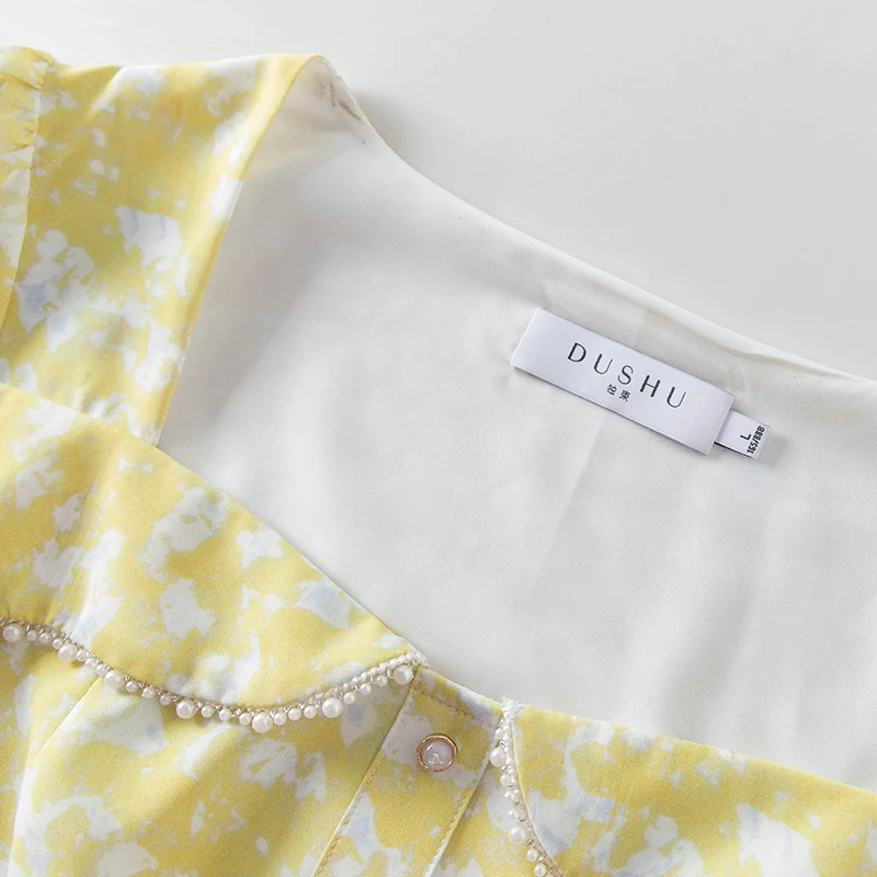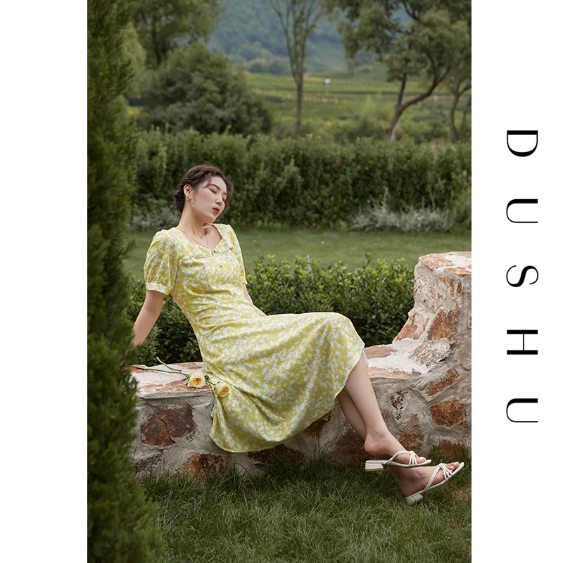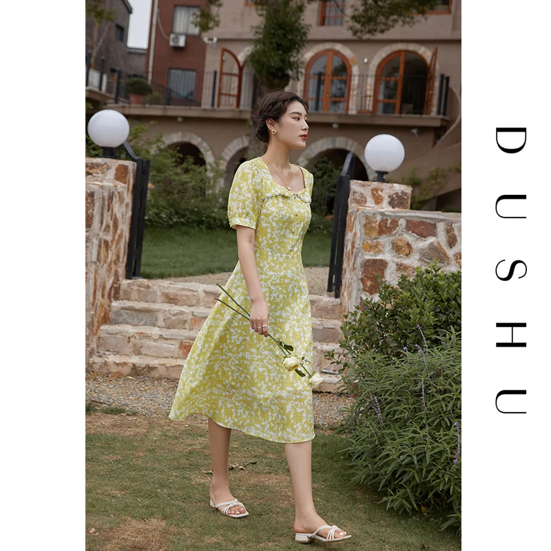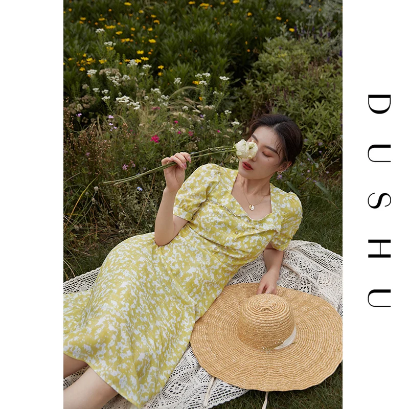 Платье DUSHU женское офисное свободное с жемчужинами, французское кружевное ретро-платье с высокой талией, цветочным принтом и пышными рукавами, с квадратным вырезом, лето 2021