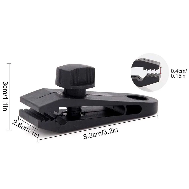 Название продукта: навес тент зажимВес: 26 г/шт.Параметры: длина 8.3cmx высота 3cmx ширина 2,6 cmcmМатериал: нейлонЦвет: черныйПрименение: подходит для фиксации предметов домашнего обихода, стационарных автомобильных принадлежностей, навесов, брезентов, теневых полотен, спальных мешков и других предметов, которые должны быть в комплекте. Навес и тент-брезентовый дождь в течение длительного времени. Фиксированный край мягко тянет дождевую воду вниз! Когда сильный ветер заставляет навес встряхнуть, зафиксируйте края, чтобы сделать навес твердым! Дополнительное фиксирующее кольцо не требуется. Это очень удобно, чтобы исправить его везде, где вы хотите, чтобы исправить это!
