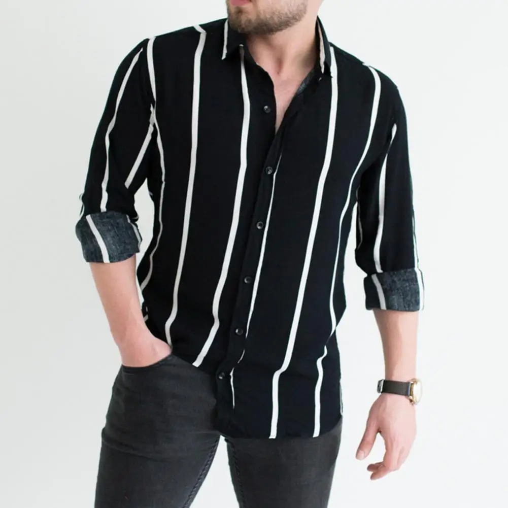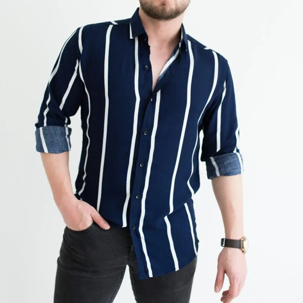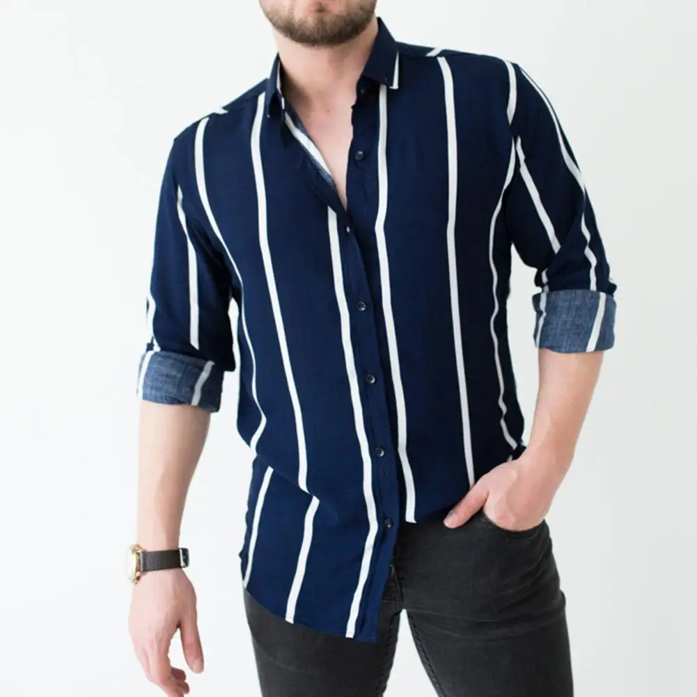 Мужская приталенная рубашка в полоску, деловая рубашка с отложным воротником, длинными рукавами и пуговицами на застежке, новинка 2021