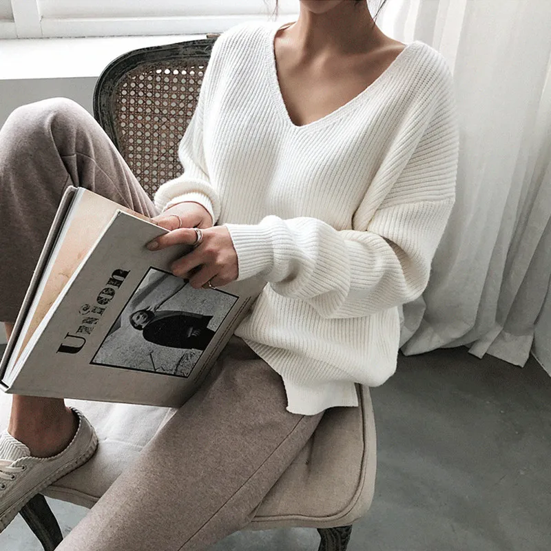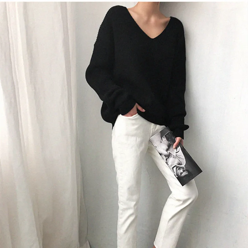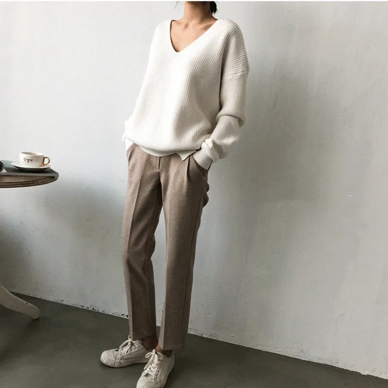 Свитер женский однотонный на флисе, с V-образным вырезом и длинным рукавом, на зиму, 2021