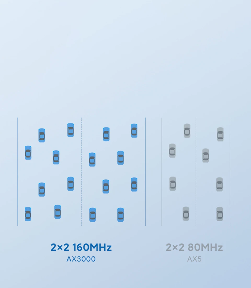 AX3000 использует технологию WiFi6 нового поколения, 5G Частотный диапазон поддерживает пропускную способность 2x216OMHz, двухдиапазонную беспроводную скорость до 2976 Мбит/с *.