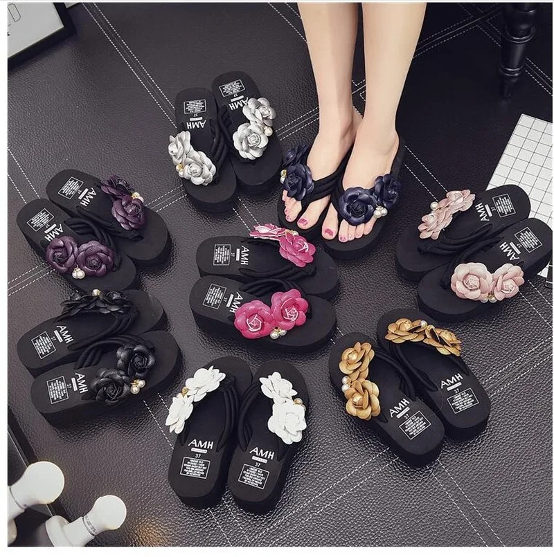 Сандалии женские на плоской подошве, богемные пляжные шлепанцы с цветами, тапки на платформе, удобная летняя обувь, c504