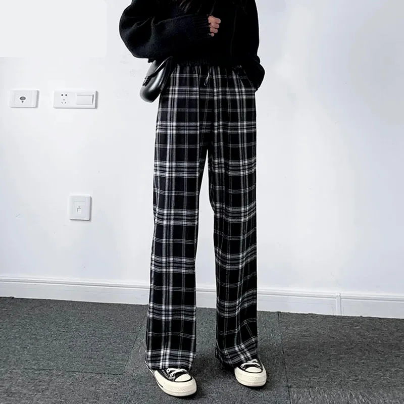 Брюки женские повседневные с завышенной талией, Модные Узкие свободные прямые штаны в стиле ретро, брюки с широкими штанинами в черно-белую клетку, на лето
