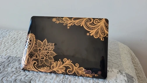 I bought the high gloss, black lace stamping MacBook M1 cover - the design in my review is chic and elegant and looks just like the photo. High gloss skin that cleans easily with just a paper- it's a bit of a fingerprint magnet but really easy to clean. Fit was a little snug for my laptop, top cover went on easier than bottom cover but once I managed to get it fitted it's good. Bottom lid has plenty of breathe space so my machine has never overheated. I have two laptop skins from MTT and I love both of them. Good products!