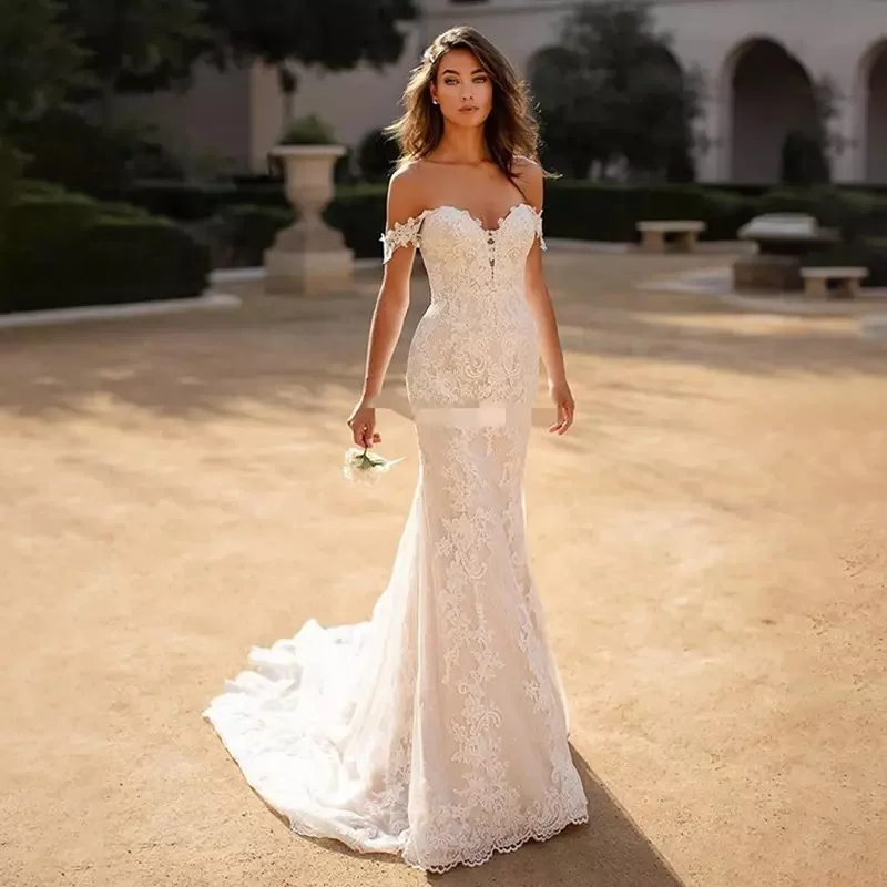 Женское свадебное платье с юбкой-годе, открытыми плечами и шлейфом