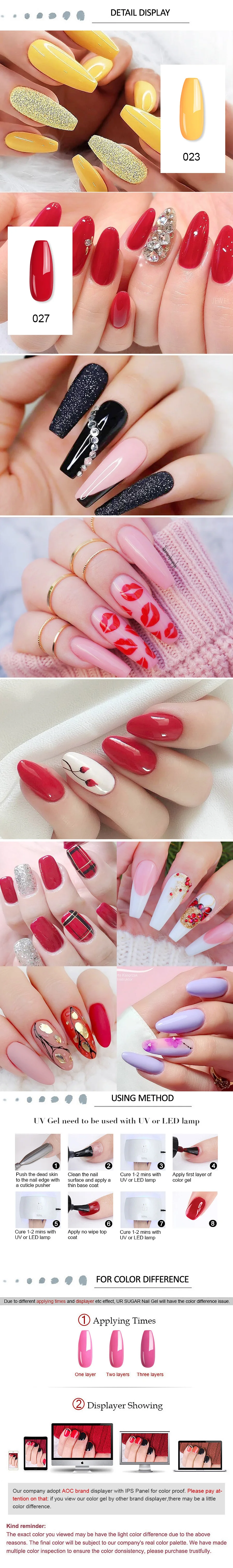 Спецификация:Бренд: UR сахарТип: Гель-лакЦветовая Таблица: 80 цветов УФ-свет для ногтейКол-во: 1 бутылкаОбъем: прибл. 7,5 млСостав: смолаДлительный период: около 15 дней или болееИнструменты для отверждения: УФ-лампа или Светодиодная лампаКомплектация:1 бутылка 7,5 мл UR сахар цветной гельProposition:Он изготовлен из здоровых, экологически чистых, экологически чистых, не ядовитых, резких химических материалов.Быстро сохнет с любым УФ-светом.Длительный срок службы не менее 2-3 недель, фантастические и супер яркие ногти для вас.Этот Гель-лак для ногтей легко наносится и отмачивается.Позвольте вам для профессионального или домашнего дизайна ногтей.Профессиональный подарок для ногтей для себя или вашей подруги.Профессиональный использование:Шаг 1. Очистите ногти, затем закрепите поверхность ногтей как обычный процесс дизайна ногтей.Шаг 2. Полностью встряхните лак, он может сделать лак сбалансированным. (ВАЖНО)Шаг 3. Сначала нанесите базовый гель, который может сделать лак длительным дольше, вылечите с помощью УФ-гелевой лампы или светодиодной лампы для ногтей. (Необходимо)Шаг 4. Нанесите первый слой цветного УФ-геля непосредственно, вылечите УФ-лампой в течение 2 минут или вылечите светодиодной лампой в течение 60 секунд.Шаг 5. Нанесите второй слой цветного геля, а затем немедленно вылечите УФ-лампой в течение 2 минут или вылечите светодиодной лампой в течение 60 секунд.Шаг 6. Покрытие без протирания верхним слоем, вылечено УФ-лампой или светодиодной лампой.Удалите наш УФ-гель лак для ногтей шаг:• Замочите ногти в миске с небольшим количеством ацетона или оберните каждый ноготь ватным диском, смоченным ацетоном, в течение 5-10 минут.• Продукт станет мягким, и вы можете аккуратно отпиливать его или сползать с помощью небольшой деревянной палочки.Важное примечание:1. Избегайте контакта с кожей. Если возникают покраснения или другие следы отрицательной реакции, немедленно отмените использование.2. Сохраняет герметичность. Беречь от солнечного света. Хранить в недоступном для детей месте.Обратите внимание:Пожалуйста, избегайте контакта с кожей. В случае аварии или если вы чувствуете себя нездоровым, немедленно обратитесь за медицинской консультацией (покажите этикетку, когда это возможно)