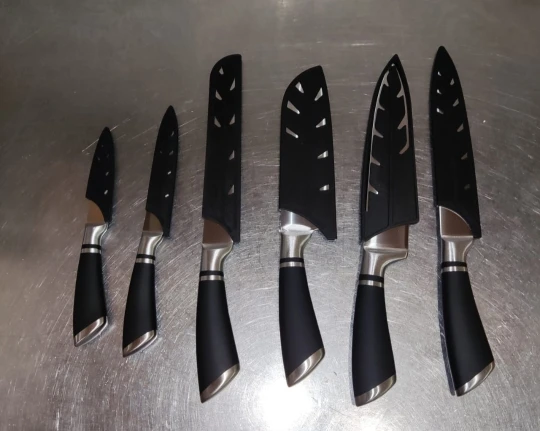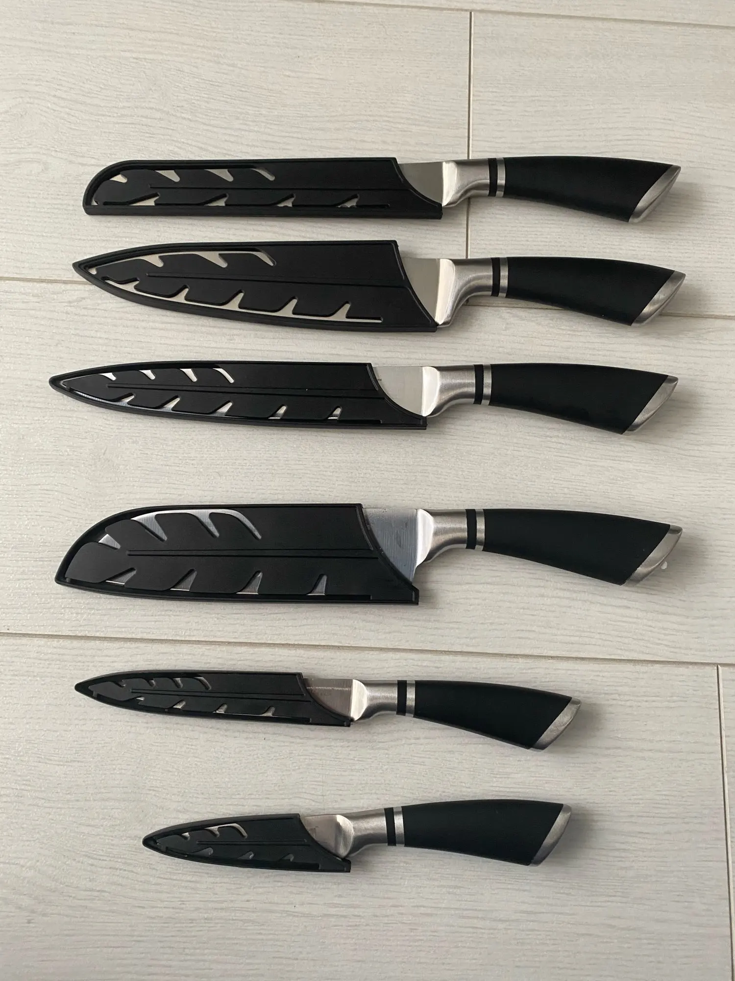 Ножи вполне себе норм. Доставка 4 дня по Москве курьером СДЭК. Брал за 1300 р. Упаковочны добротно ,в прочную картонную коробку внутри каждый нож в пупырчатом чехле, положены пенопластовыми листами . Обнаружен небольшой косячок на рукоятке - для меня совсем не критично (на фото). В описании не указано , что ножи в пластиковых чехлах. С продавцом не общался.