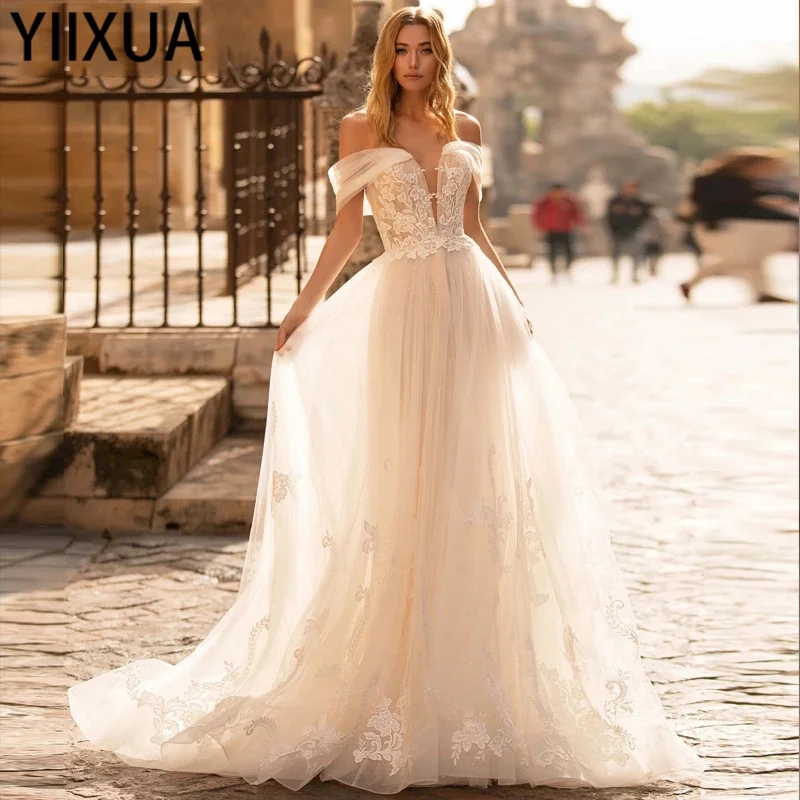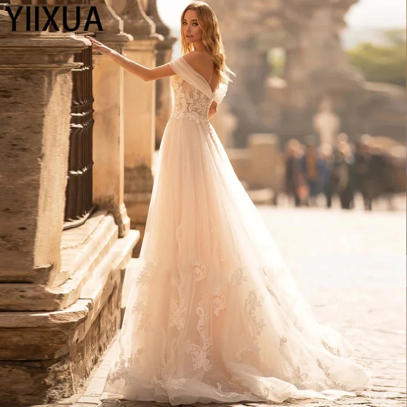 YiXuan пляжное богемное мягкое Тюлевое Элегантное Длинное кружевное свадебное платье А-силуэта с аппликацией открытыми плечами и открытой спиной для особых случаев