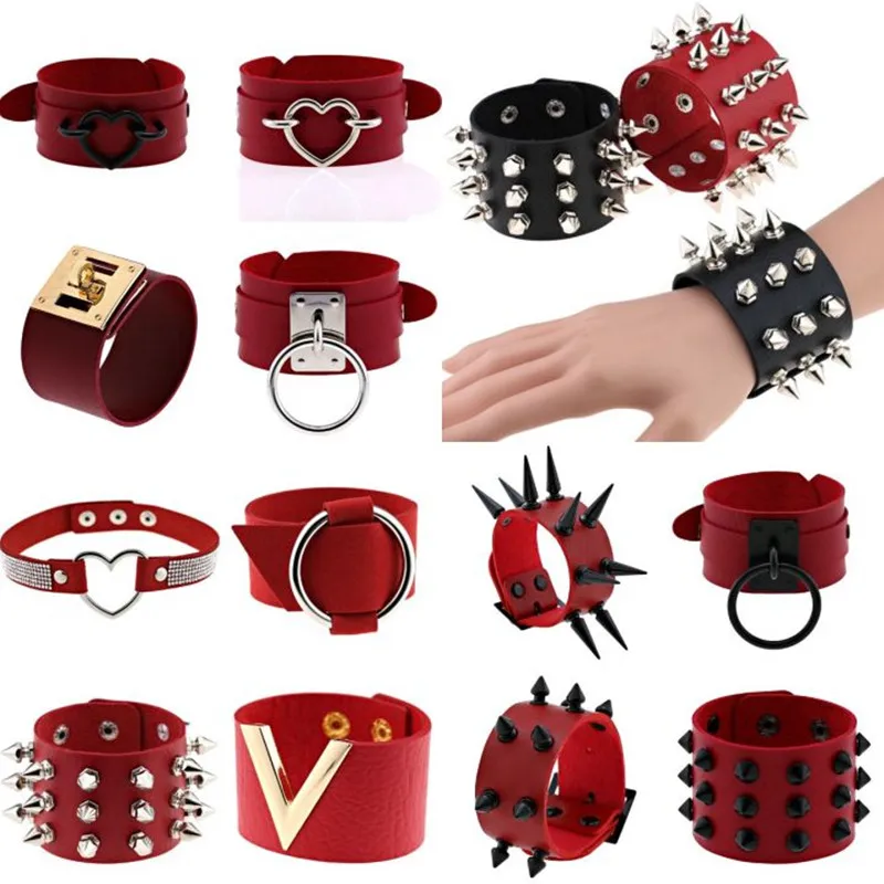 Boho Спайк Браслеты с заклепками для женщин панк готика красный ПУ кожаный браслет манжеты браслеты шипованные Хэллоуин праздничные украшения Harajuku