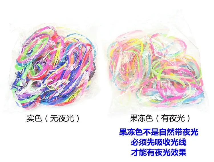 Силиконовый браслет, Ширина-около 0,5 см, окружность составляет около 18-19 см;Светящиеся модели, больше цветов, Случайная Доставка.Могут быть силиконовые заусенцы, просто обрежьте их, это не проблема качества, если вы возражаете, не покупайте!В зависимости от партии продукции, текст на браслете будет отличаться, и доставка будет случайной.【Инструкции 】:Светящийся браслетВы должны использовать светильник, чтобы сиять, прежде чем браслет может иметь светящийся светильникНо Предпосылка: светильник должен быть поглощен более 5 минутВы можете видеть свет в темнотеПеред тем, как светильник облучится ночью, выключите светильник, чтобы увидеть, нет ли ночной СветильникТем не менее, если вы поместите этот браслет под фонарик или настольную лампу на свой мобильный телефон и облучите его в одиночестве более 5 минутЗатем выключите светильник, вы можете увидеть светильник в темнотеДорогие друзья, этот браслет должен поглощать достаточно светильник (более 5 минут сильный светильник)