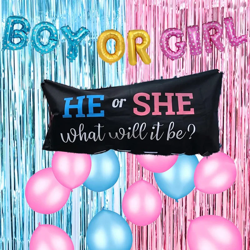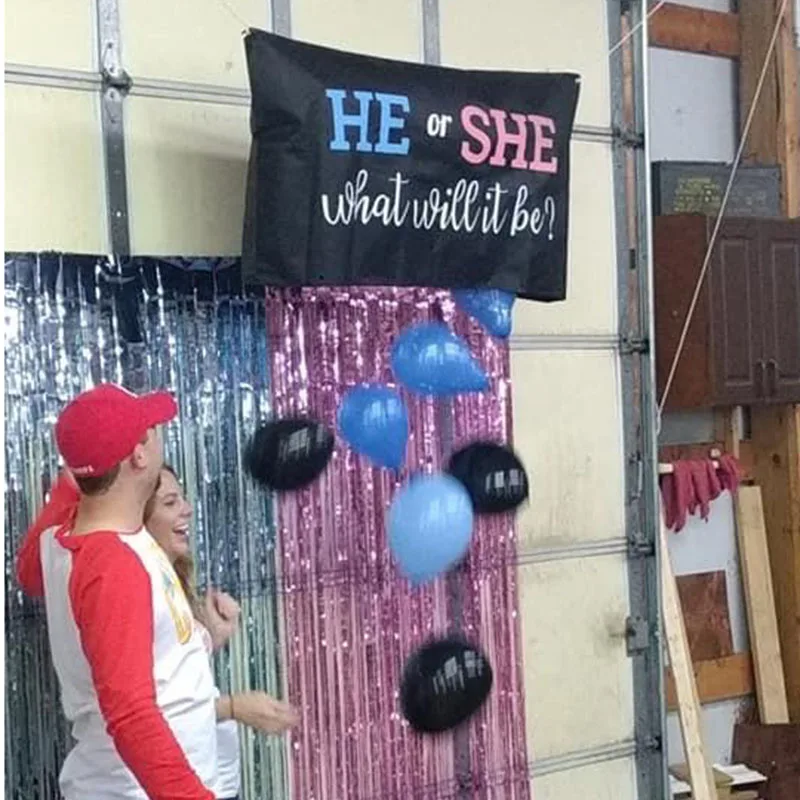 Мальчик или девочка пол раскрыть вечерние ринки принадлежности он или она шар падение мешок металлик мишура фольга занавеска фото Декорация