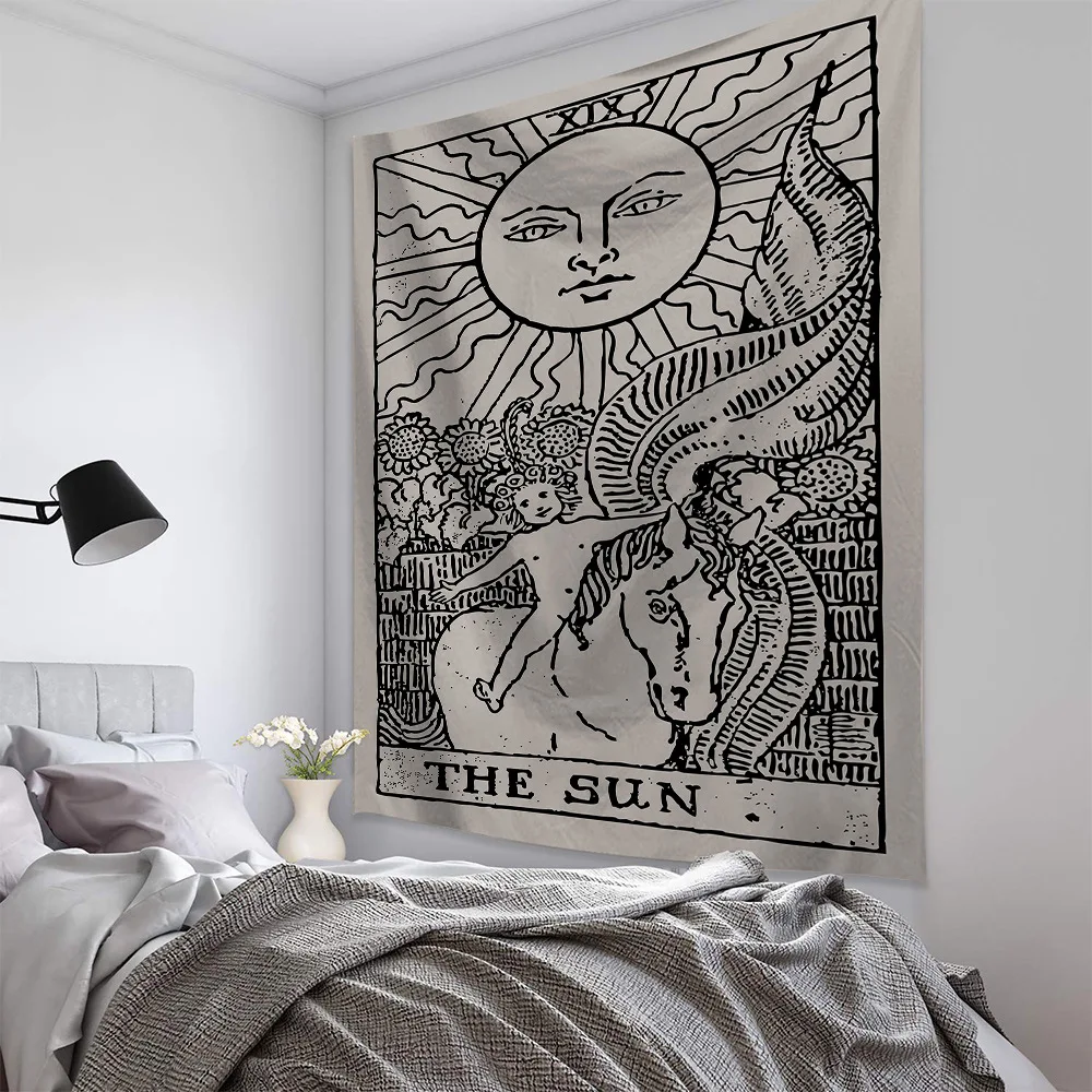 Гобелен солнце, настенный гобелен с акварелью, луной, черно-белые б...