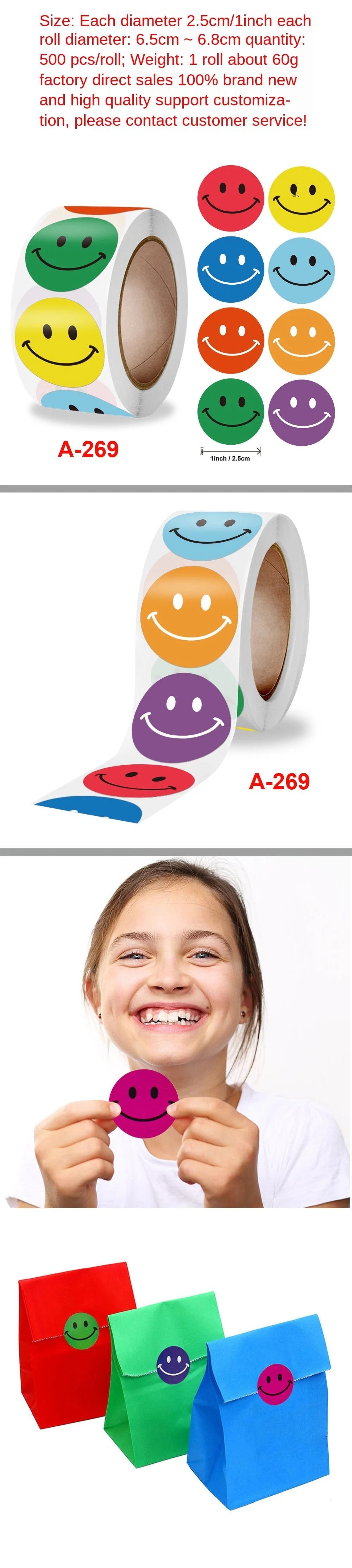 Мультяшные цветные круглые детские наклейки, наградные наклейки, рулон, наклейка со смайликом
