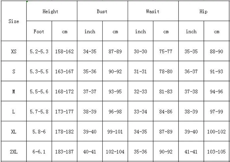 Советы:1 Пожалуйста, проверьте информацию о размерах перед тем, как вы покупаете. (все размеры указаны в см, пожалуйста, примите во внимание, что 1 см = 0,39 дюйма, 1 дюйм = 2,54 см);2. Пожалуйста, укажите правильный адрес после оплаты;3. Транспортировка на большие расстояния. Транспортировка может привести к появлению морщин в одежде.4 таможенные пошлины, местные налоги и сборы не включены в стоимость товара или стоимость доставки.5. Ваши отзывы очень важны для нас, пожалуйста, уделите несколько секунд, чтобы дать отличные отзывы, если вы удовлетворены нашими продуктами и услугами, большое спасибо!100% Новый брендЭта информация о размерах только для справки. Пожалуйста, сравните приведенные размеры с вашими и, пожалуйста, учтите что допускается погрешность в 1-3 см разницу в размерах ввиду того, что Замеры производились вручную, спасибо (все размеры указаны в см и, пожалуйста, примите во note1cm = 0,39 дюймов).Типы тела, замеры песка специфические конструкции могут незначительно отличаться в размерах. Цвет товара, отображаемый на фотографиях, может немного отличаться на мониторе вашего компьютера, так как мониторы не откалиброваны так жеМы заботимся о наших уважаемых клиентах и всегда будем стараться вам помочь, надеемся установить с вами долгий бизнес
