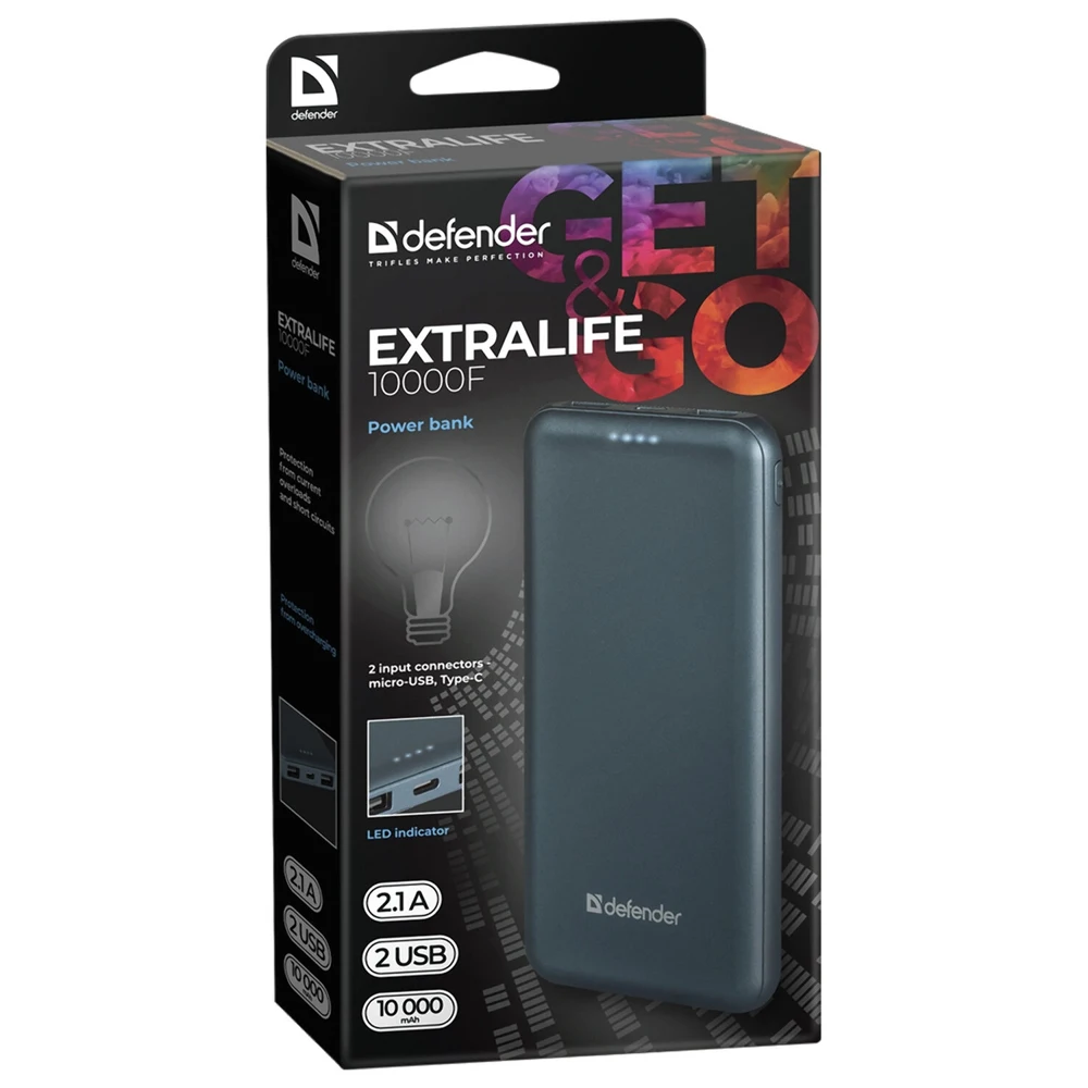 Аккумулятор внешний DEFENDER EXTRALIFE 10000F, 10000 mAh, 2 USB, Li-pol, синий, 83663