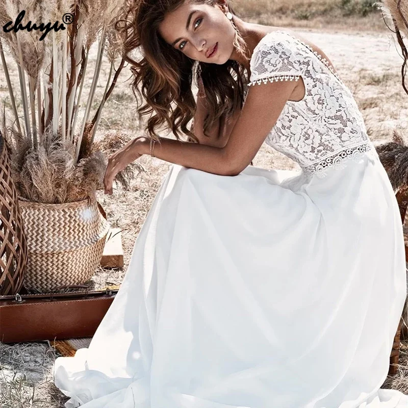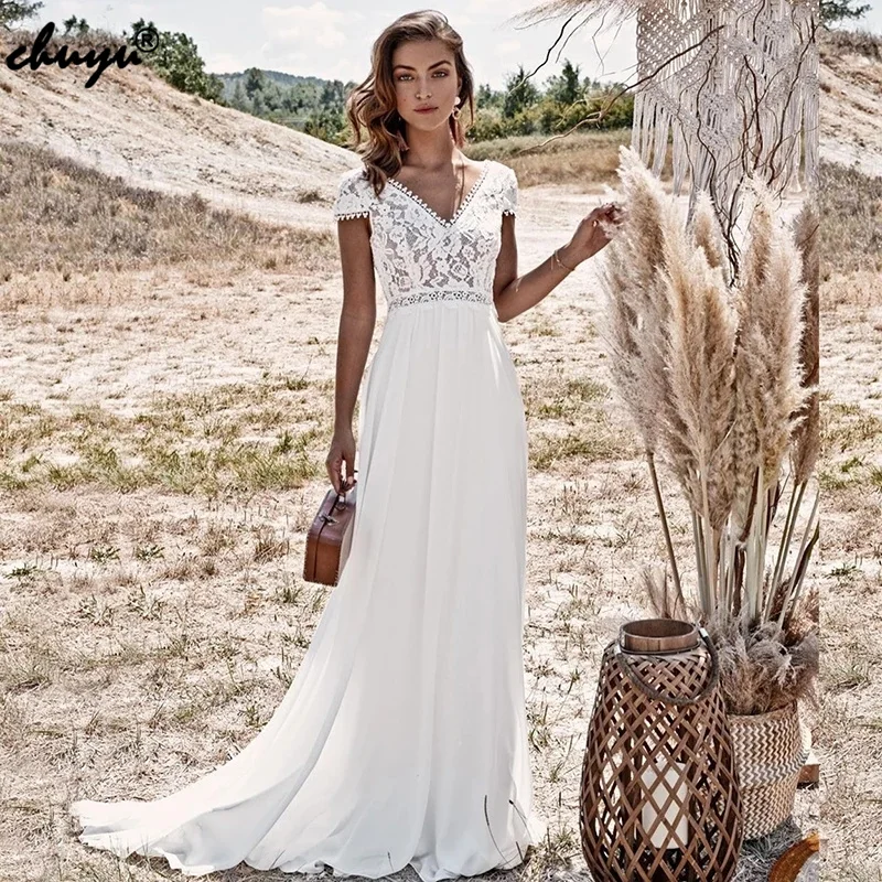 Пикантное Летнее Длинное красивое шифоновое свадебное платье ChuYu в стиле бохо с короткими рукавами и аппликацией, ТРАПЕЦИЕВИДНОЕ ПЛАТЬЕ С Открытой Спиной для особых случаев