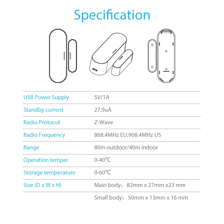 Установите на дверь или окноРаботает от батареиЛегко устанавливается с помощью scews или наклейкиСвязать с другими устройствами через шлюзСовместим с любым сертифицированным шлюзом zwaveМожет питаться от USBZwave Plus 700series, легко устанавливается.