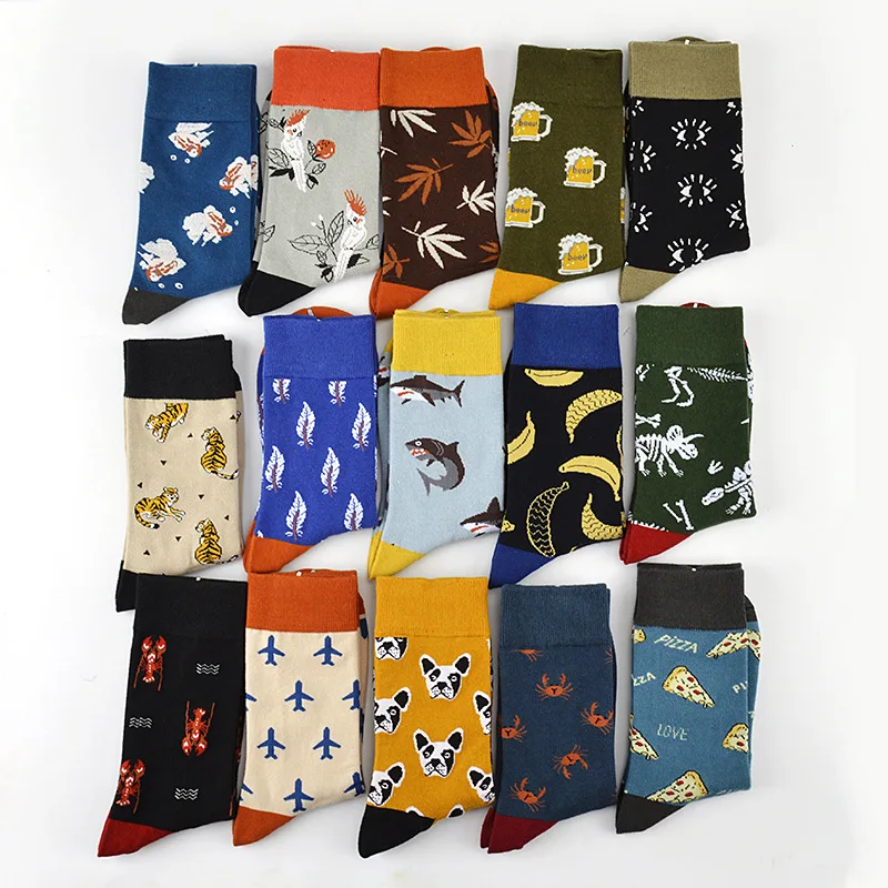 Мужские хлопковые носки высокого качества, Носки с рисунком самолета, акулы, пива, банана, тигра, динозавра, пиццы, собаки, мужские носки в стиле хип-хоп, веселые счастливые мужские носки