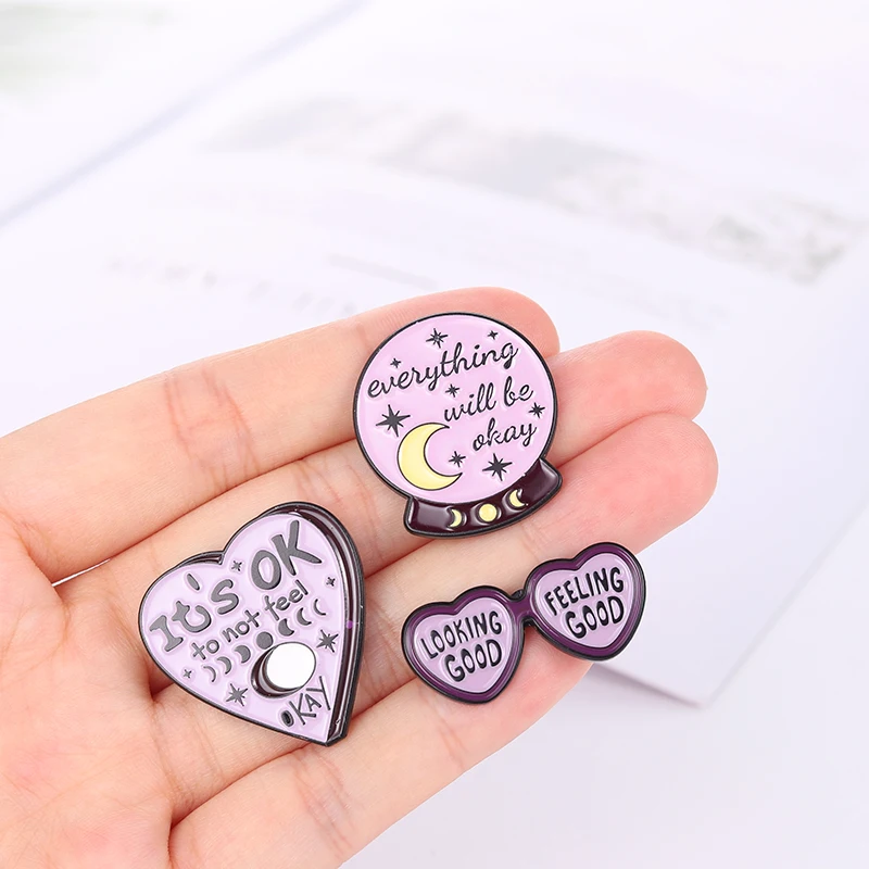 Эмалевые булавки с фиолетовым сердцем, фазой Луны, мотивационные ци...