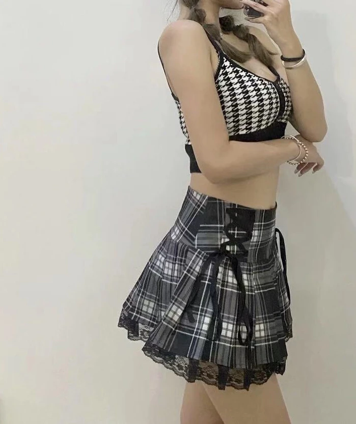 Розовая клетчатая плиссированная юбка Y2k с высокой талией, пикантная мини-юбка на молнии, уличная готическая юбка на шнуровке, Женская юбка