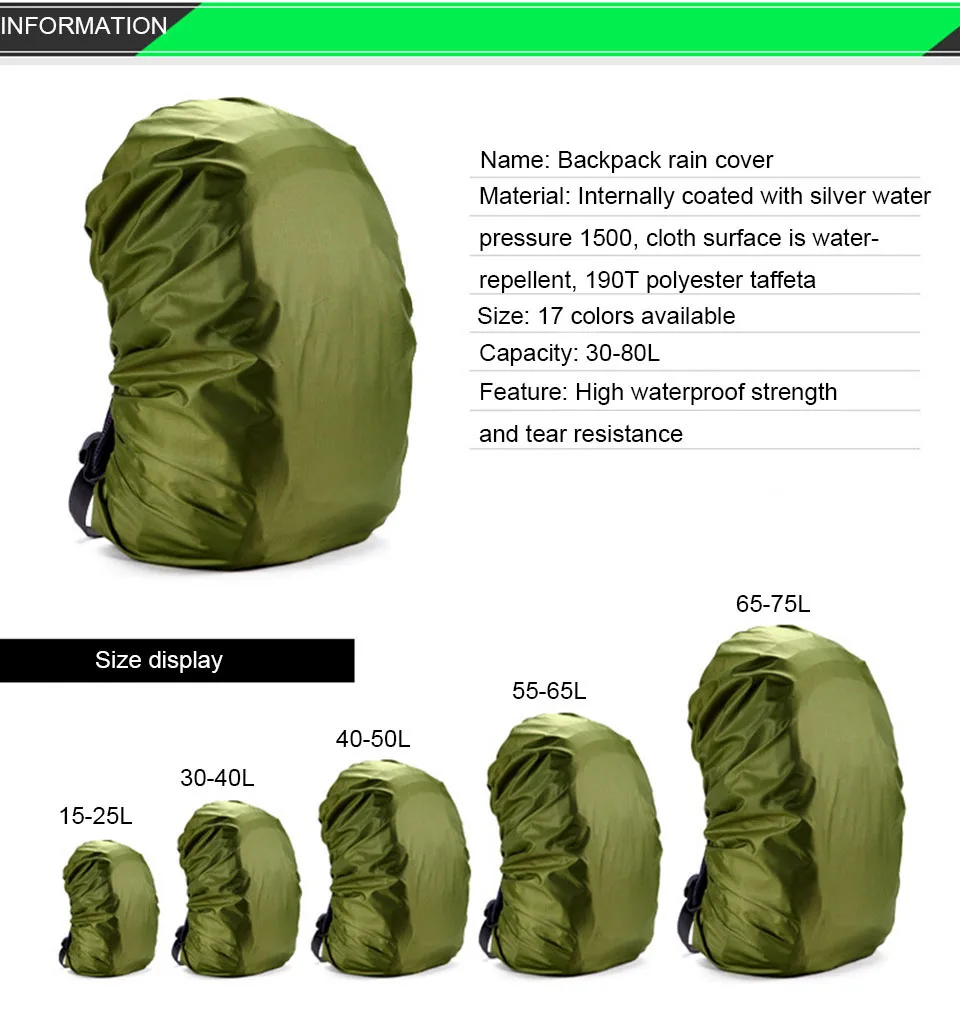 Название: дождевик для рюкзакаЦвет: доступно 6 цветовРазмер:Aliexpress выбор: 20 л Емкость: (15-25 л)Aliexpress выбор: 30-40 л Емкость: (30-40 л)Aliexpress выбор: другая реальная емкость: (40-50 л)Aliexpress выбор: 50-70 л Емкость: (55-65 л)Посылка:1 чехол для рюкзакаСупер водонепроницаемый: Не допускайте попадания воды. Водонепроницаемый износостойкий нейлоновый материал может сделать его. Он может противостоять воде 2000 МПа гидравлического давления.