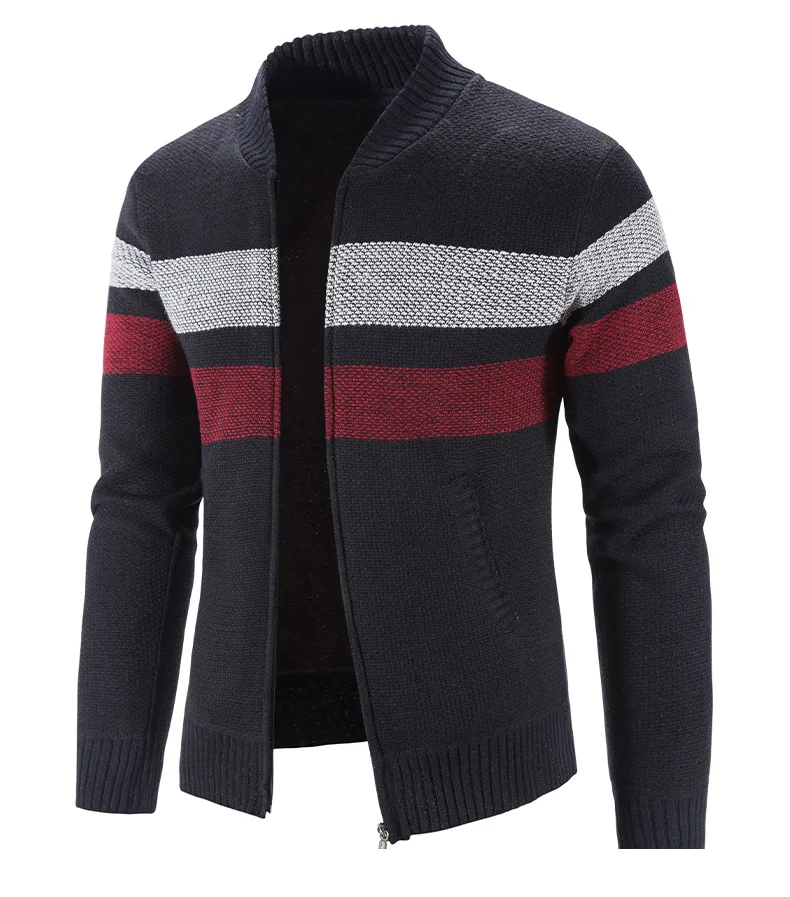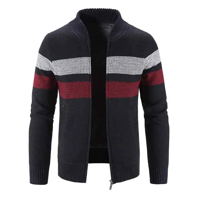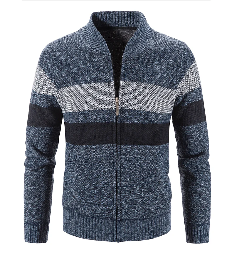 Мужская модная полосатая трикотажная одежда осеньзима свитер из искусственного меха шерстяное пальто толстый теплый Бейсбольный воротник жакет молния кардиган