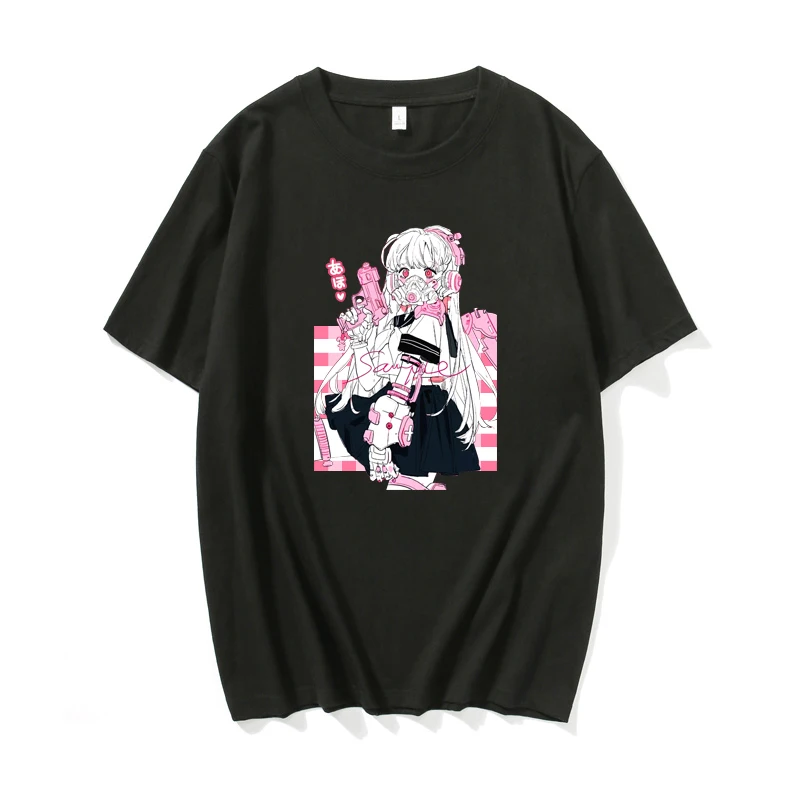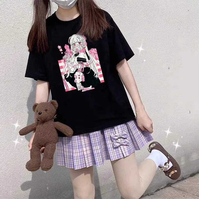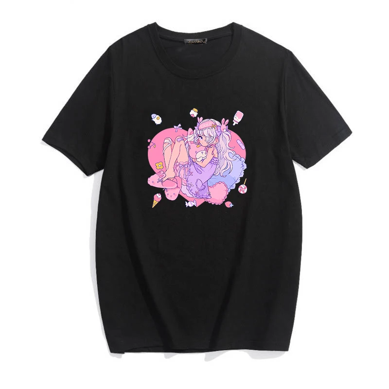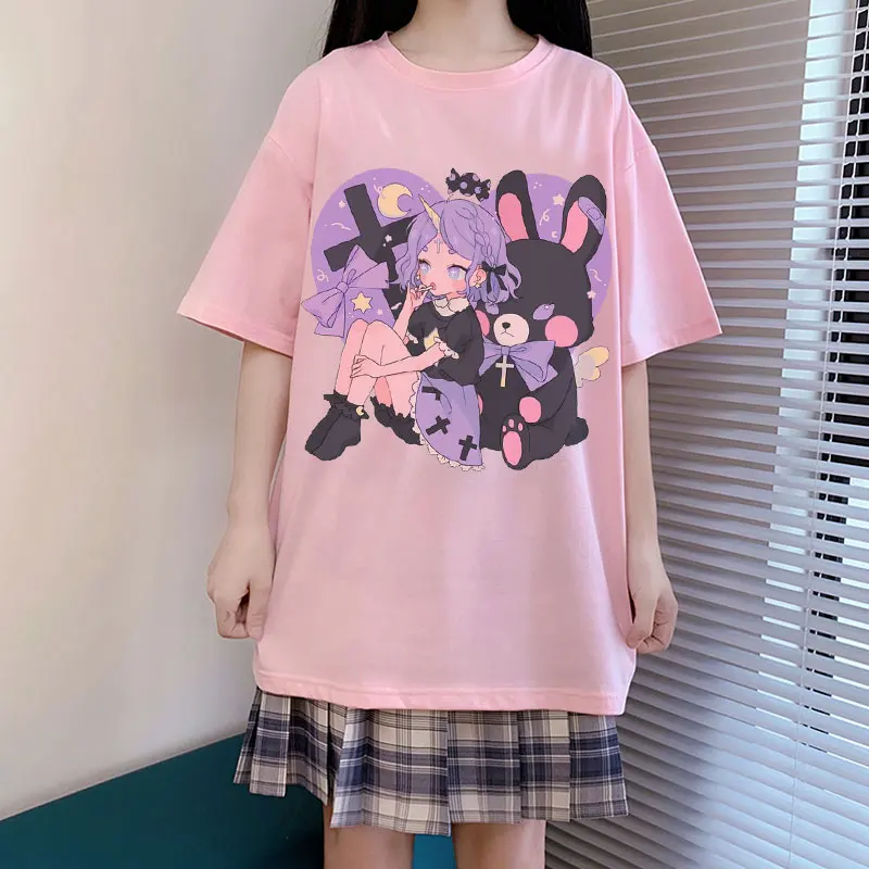 Розовый милый мультяшный милый женский японский уличный Топ Harajuku Y2K Kawaii Повседневный Топ Ulzzang Винтажный шик Свободный Женская летняя футболка