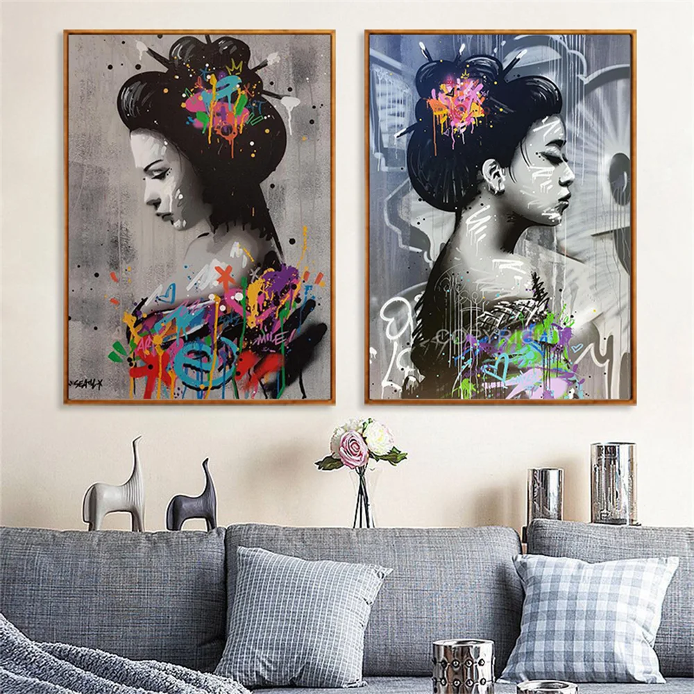 Картины на холсте с изображением граффити японской женщины, портретные картины для современной домашней стены, настенные картины, художественные плакаты и принты