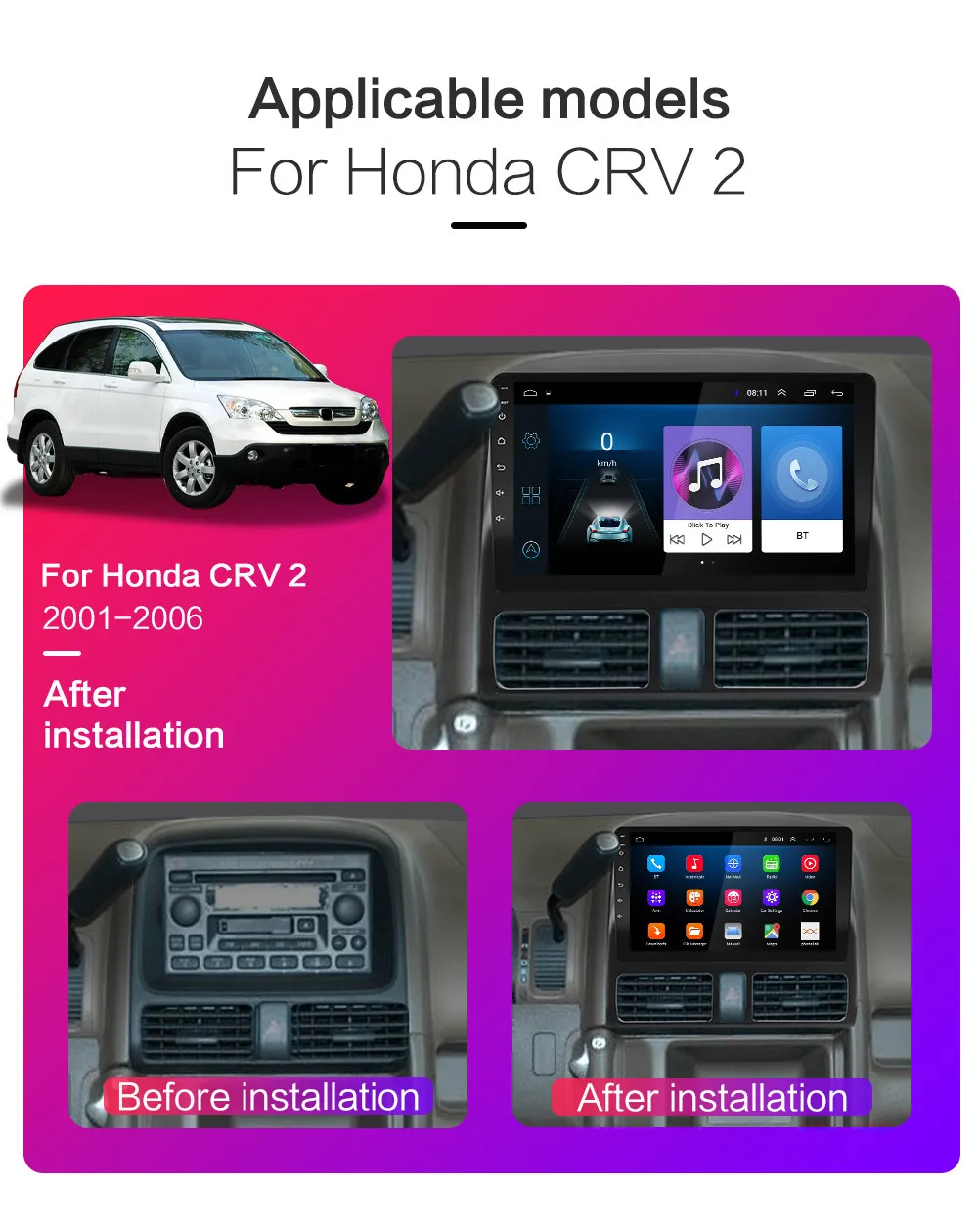 Для Honda CRV 2 2001 2002 2003 2004 2005 20061, 4-ядерная конфигурация включает (RAM + ROM): 1G + 16G / 2G + 16G / 2G + 32G / 4G-SIM-3560-2G + 32G [опционально];2, 8-ядерная конфигурация включает (RAM + ROM): 7260L-2G + 32G / 7260L-4G + 64G / 4G-SIM-5760-2G + 32G / 4G-SIM-5760-4G + 64G / 4G-SIM-TS10-4G + 32G / 4G-SIM-TS10-6G + 128G [опционально];3, 4-ядерный содержит: версию: Android 8,1;Четырехъядерный процессор MTK8227 / Cortex-A7Поддержка логотипа автомобиля 5; Заводской пароль: 8888Разрешение: HD 2.5D,1024*600;Не поддерживает функцию AM, RDS;Обыпосылка пакет версии Wi-Fi поддерживает функцию вывода видео;Версия 3560-4G-SIM-WiFi: версия: Android 8,1; Поддерживает DSP; Не поддерживает функцию вывода видео;4, 8-ядерный содержит: версию: Android 9,0 или Android 10;Восемь ядер: CPU Quad core и GPU Quad core соответственно;Поддержка логотипа автомобиля 5; Пароль завода: 8888; Разрешение: HD 2.5D,1024*600;Версия 7260L-WIFI: поддерживает функции DSP, разделения экрана; Не поддерживает выход видео;Версия 4G-SIM-5760-WIFI и 4G-SIM-TS10-WIFI: поддерживает функции DSP, Carplay, разделения экрана; Не поддерживает видеовыход;5. Операционная система Android может установить приложение Google Play store Skype Facebook youTube Twitter и т. д.;6. Поддержка: радиостанции, звонков по Bluetooth, музыки по Bluetooth, управления рулевым колесом, встроенного Wi-Fi, MP3, видео-музыки (MPG, AVI), навигации, видеовыхода, зеркальной связи, USB 4G LTE Wi-Fi ключ и другие функции;
