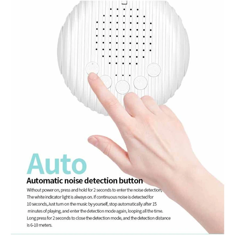 3. Автоматическое обнаружение белого шума: без включения питания, нажмите и удерживайте авто в течение 2 секунд, чтобы ввести Обнаружение шума в течение 10 с. Если шум вокруг, он автоматически включит музыку и остановится через 15 минут. Обнаружение будет циклическим. Расстояние обнаружения 6-10 м.