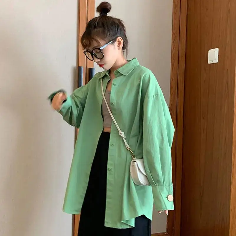 Женские весенне-осенние зеленые рубашки EBAIHUI, Свободные повседневные Однотонные блузки с длинным рукавом, корейские Модные Винтажные Дамские топы в стиле Харадзюку