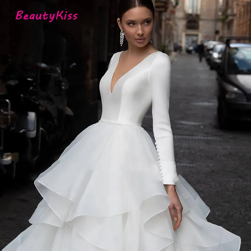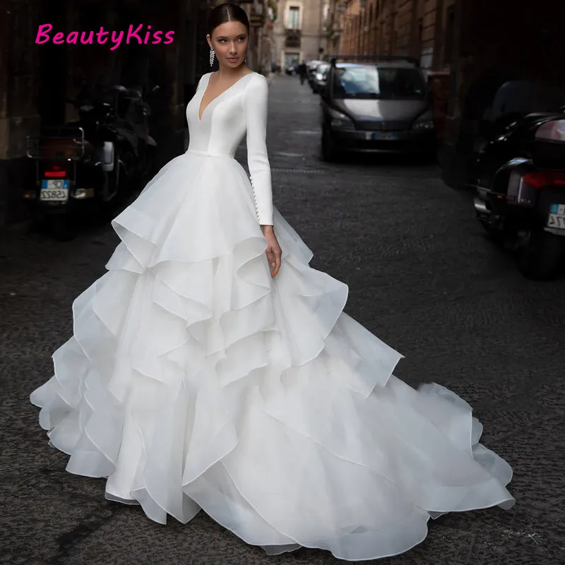 Романтическое пляжное свадебное платье с V-образным вырезом и длинным рукавом, свадебное платье принцессы из органзы с оборками и шлейфом, элегантное женское свадебное платье
