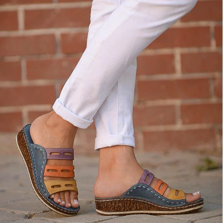 2021 женские сандалии Летняя обувь на танкетке без шнуровки; Женская обувь на толстой подошве; Шлепанцы в римском стиле, в стиле ретро с открытым носком; Шлепанцы пляжная обувь; Прямая поставка